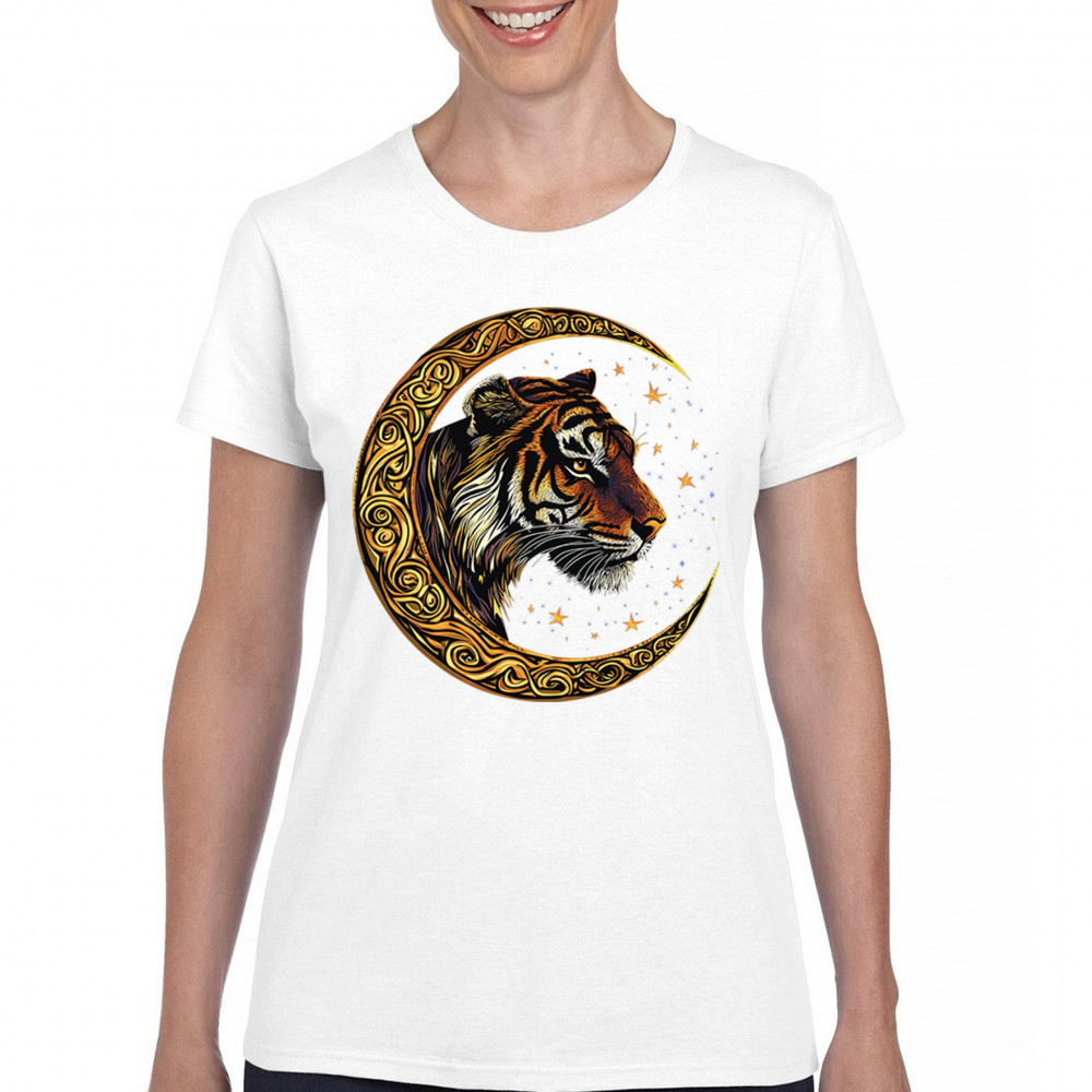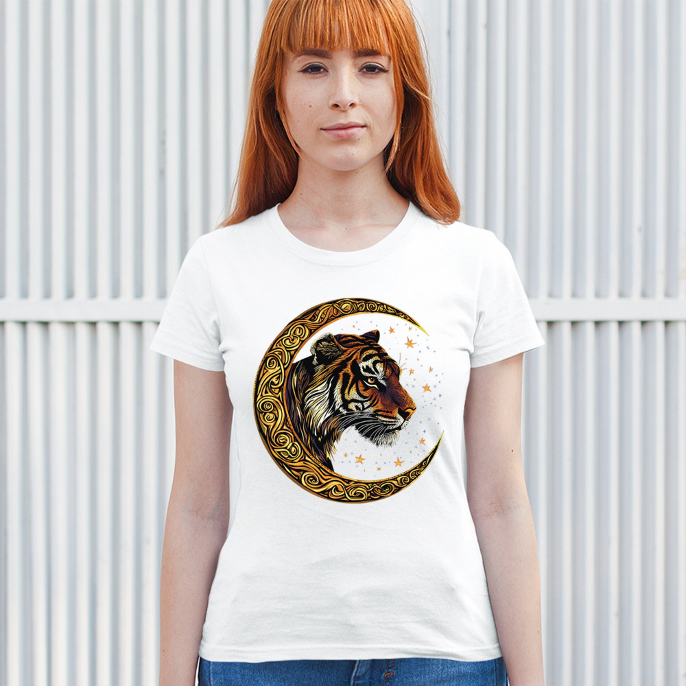 Bold tiger design in Celtic moon with cosmic sky. Symbol of strength, instinct, and jungle mysticism. Great for animal lovers and fantasy fans.
