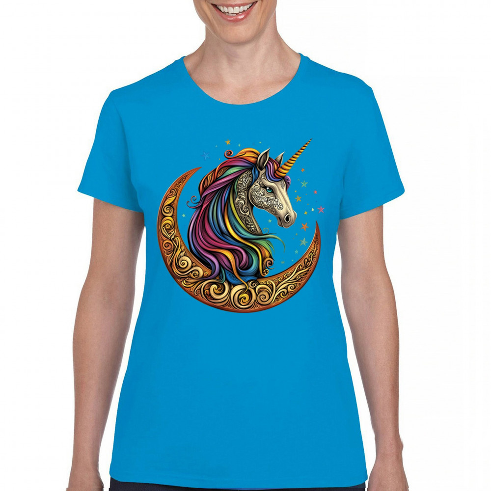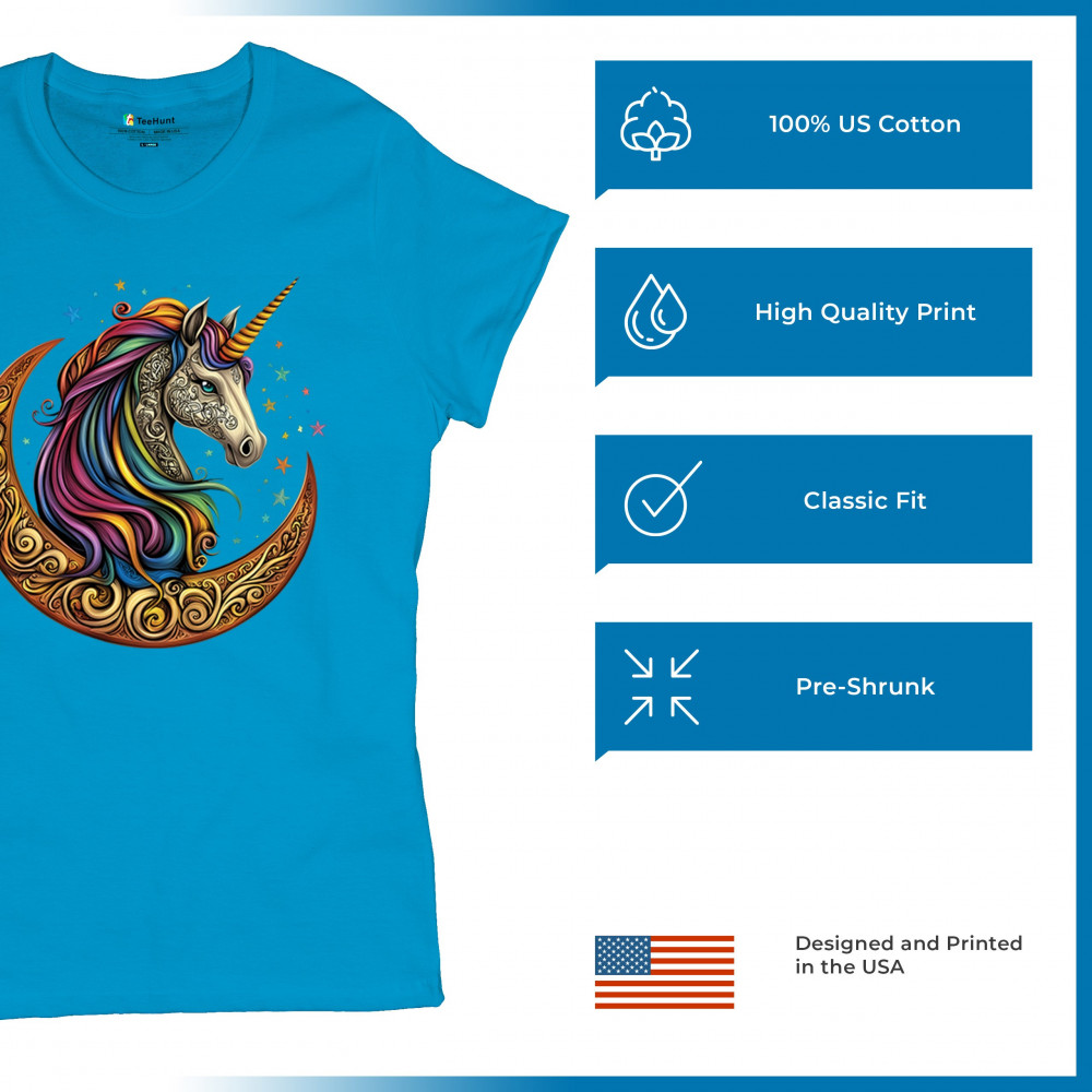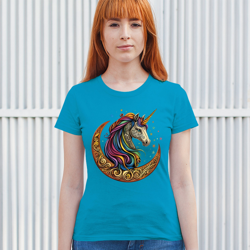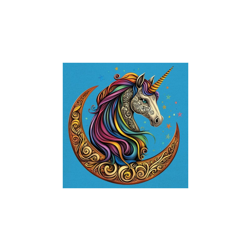 Rainbow-maned unicorn in golden Celtic moon design—perfect for fantasy lovers, dreamers, and unicorn fans who believe in magic and spirit.
