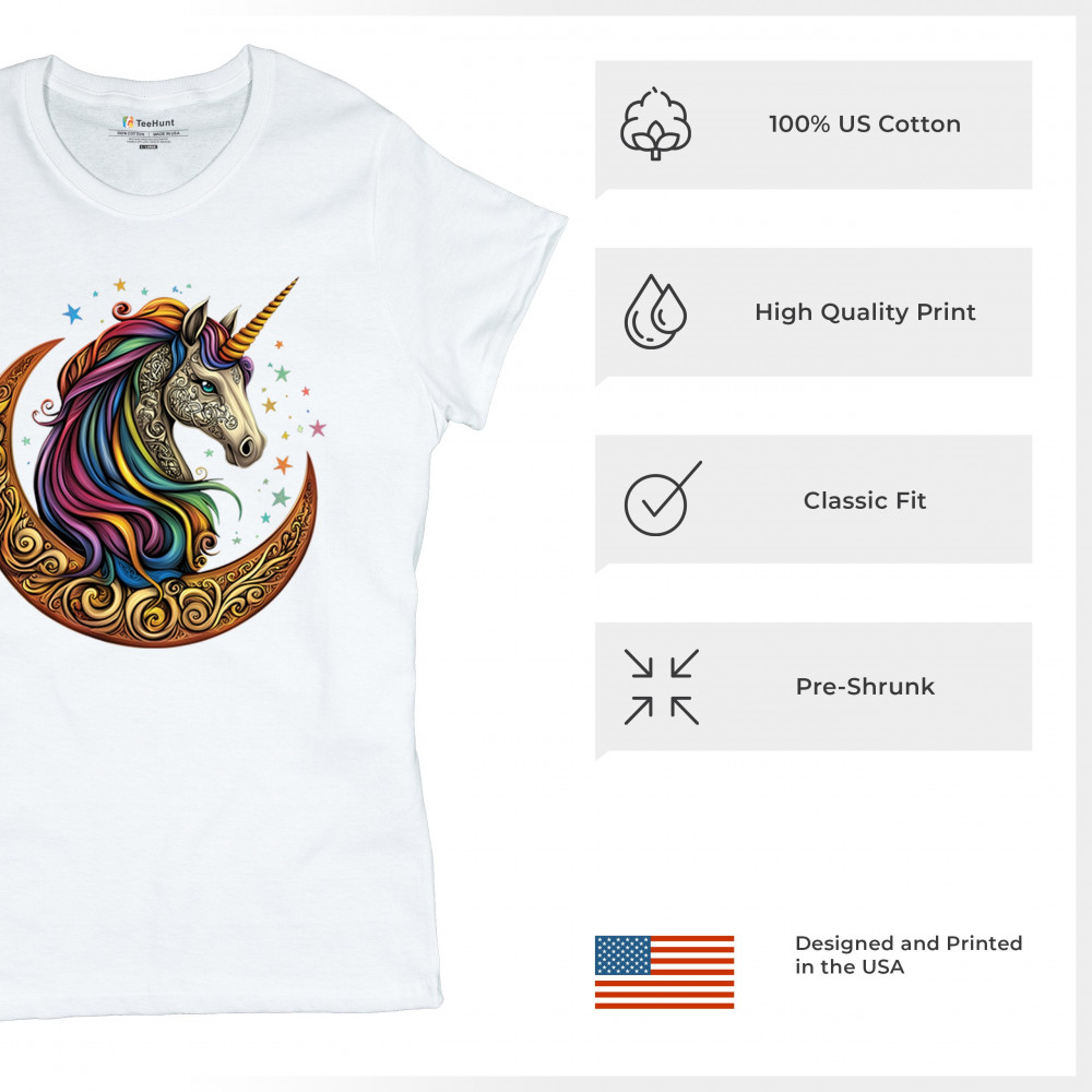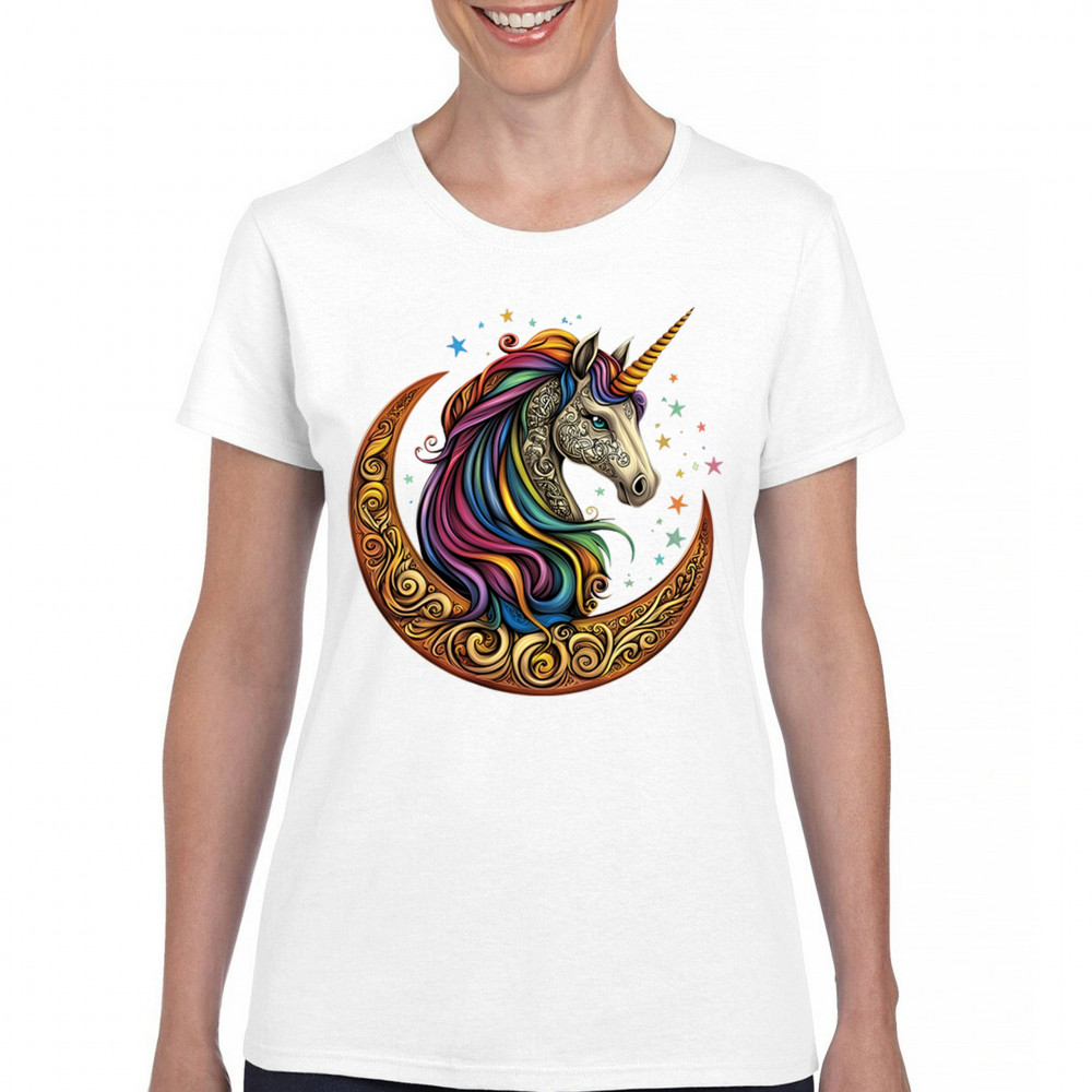 Rainbow-maned unicorn in golden Celtic moon design—perfect for fantasy lovers, dreamers, and unicorn fans who believe in magic and spirit.