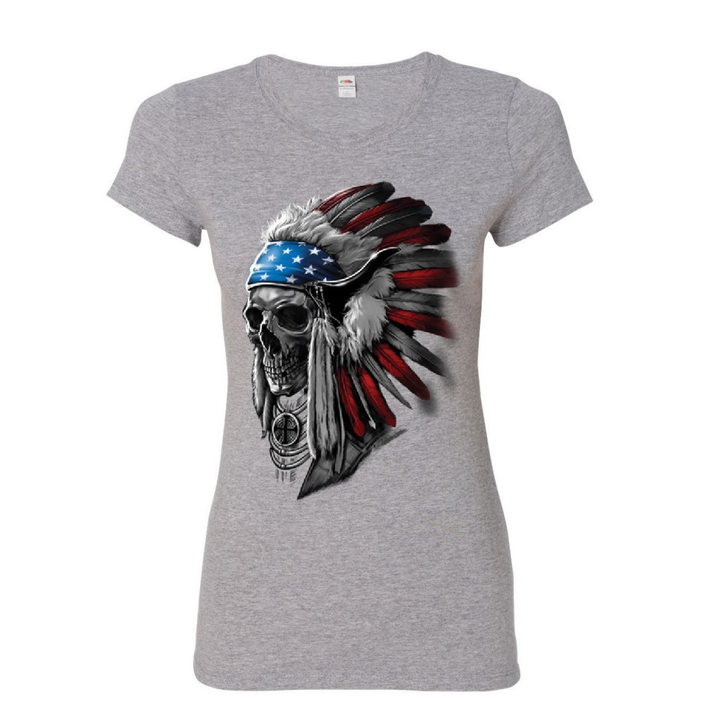 CHIEF SKULL HEADRESS women's t-shirt native american stars and stripes shirt gray