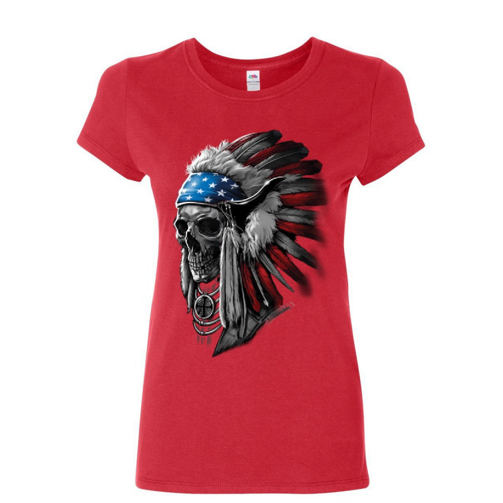 CHIEF SKULL HEADRESS women's t-shirt native american stars and stripes shirt red
