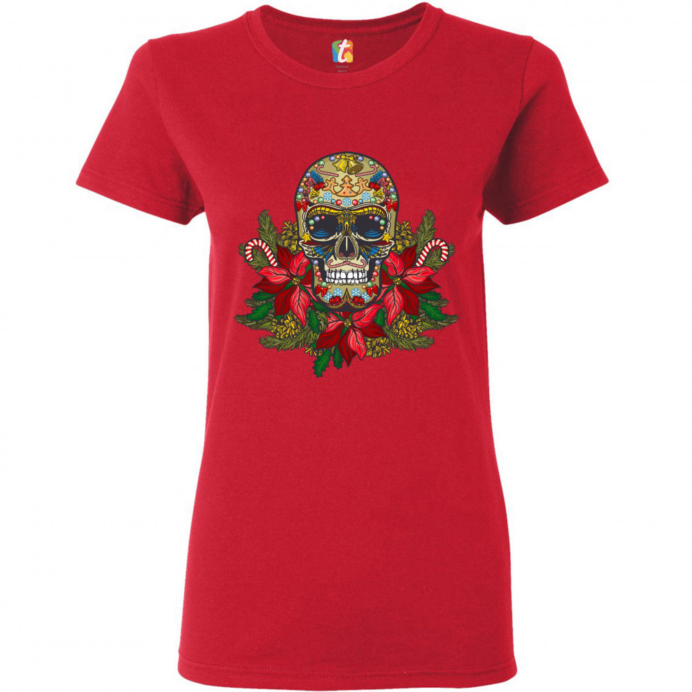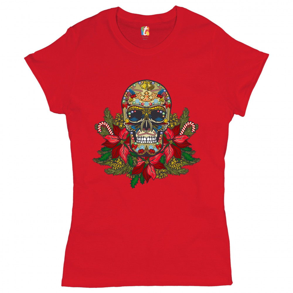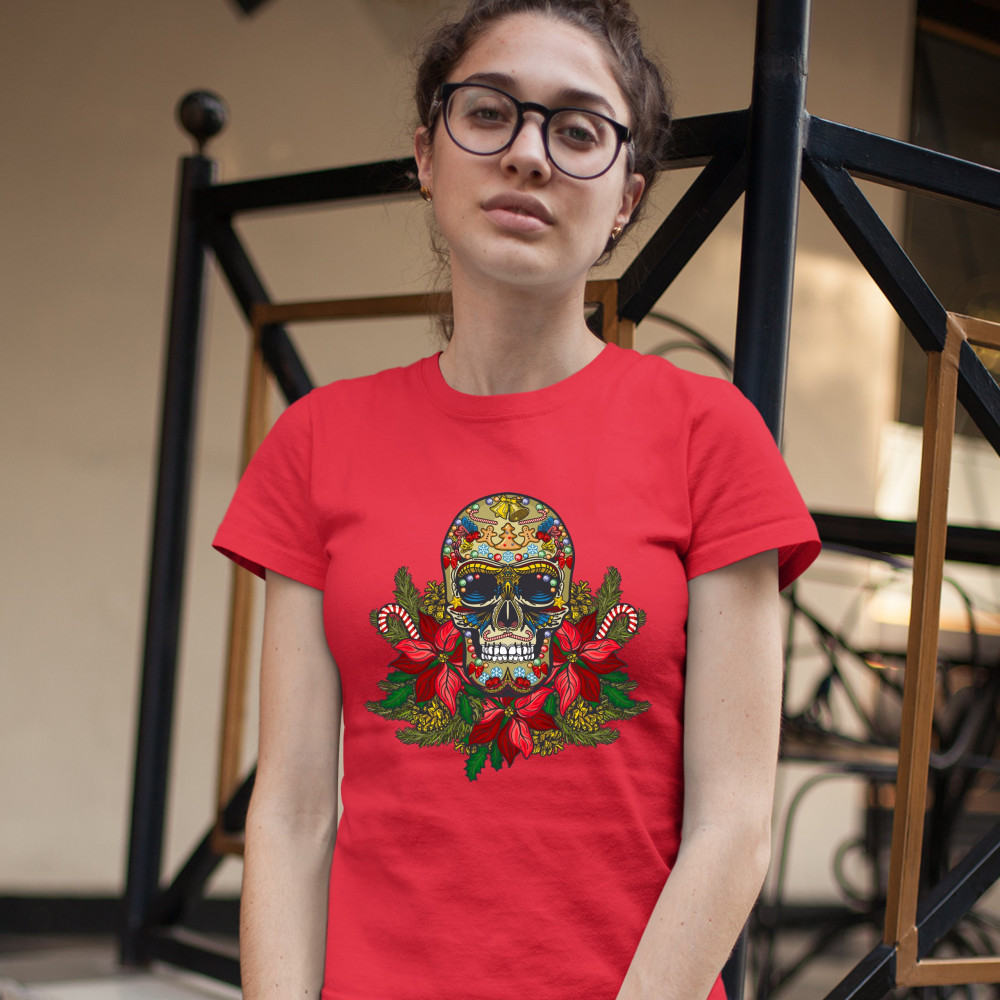 A print featuring a gorgeous sugar skull sitting atop of mistletoe. The skull is decorated with bells, candy canes and gingerbread men dancing around a Christmas tree on the forehead. It has candy canes instead of mustaches and wings underneath the eye so