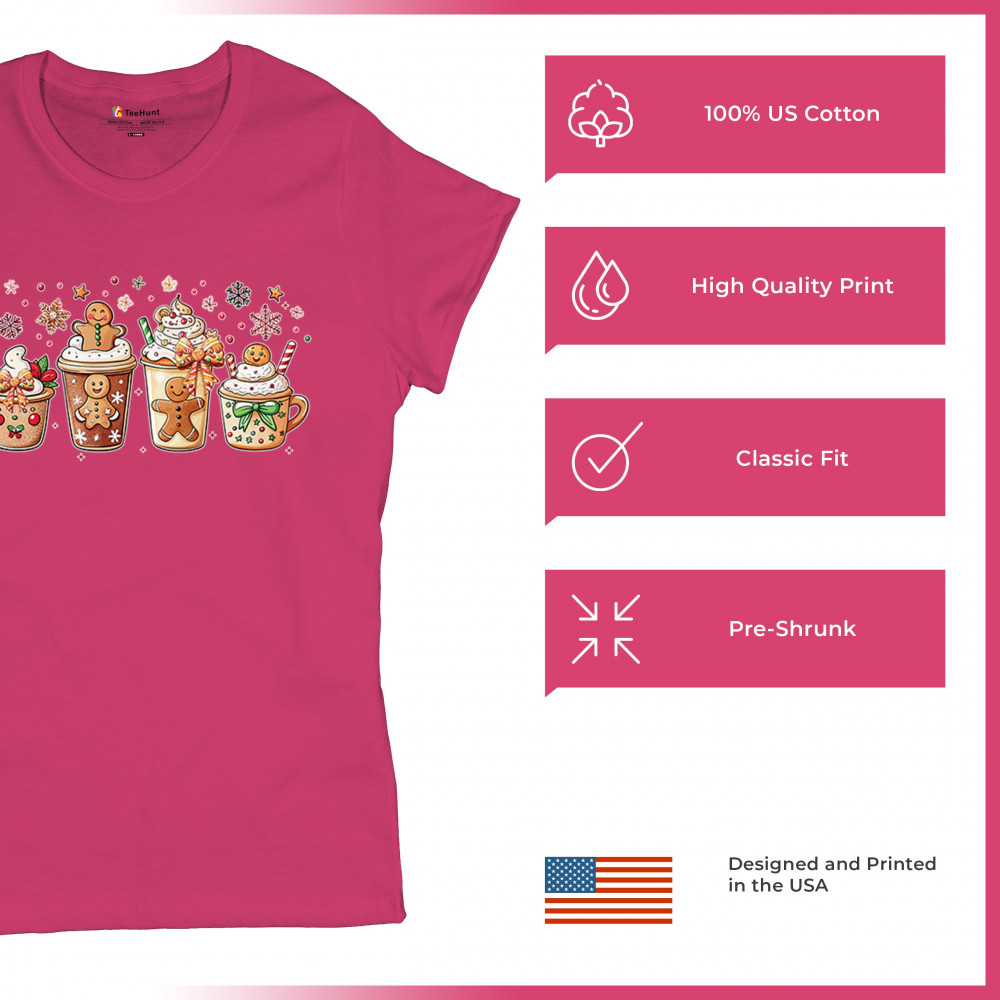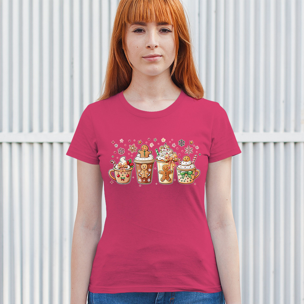 This cute Christmas drink design showcases gingerbread mugs, whipped cream, candy canes, sprinkles, and festive decorations for a warm winter aesthetic. Perfect for cocoa lovers, coffee fans, bakers, cozy holiday nights, gift exchanges, Christmas morning vibes, seasonal parties, and anyone who loves adorable dessert-inspired holiday art.