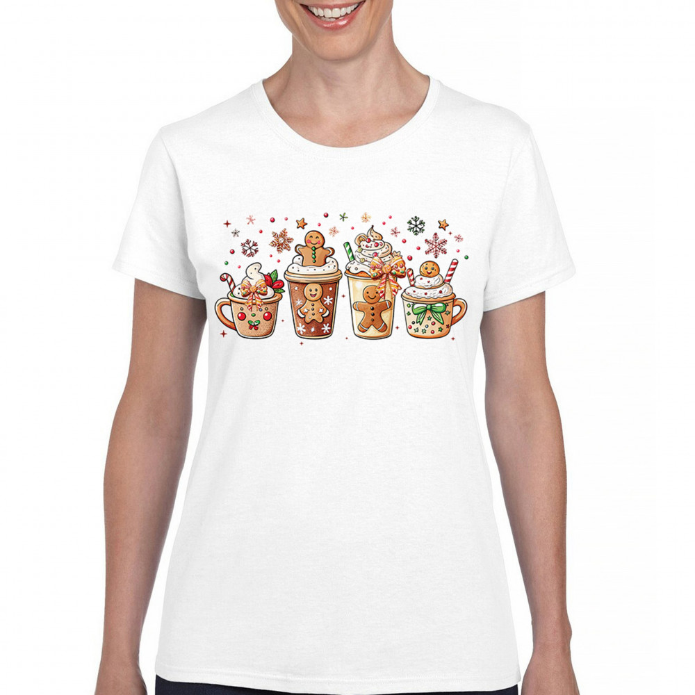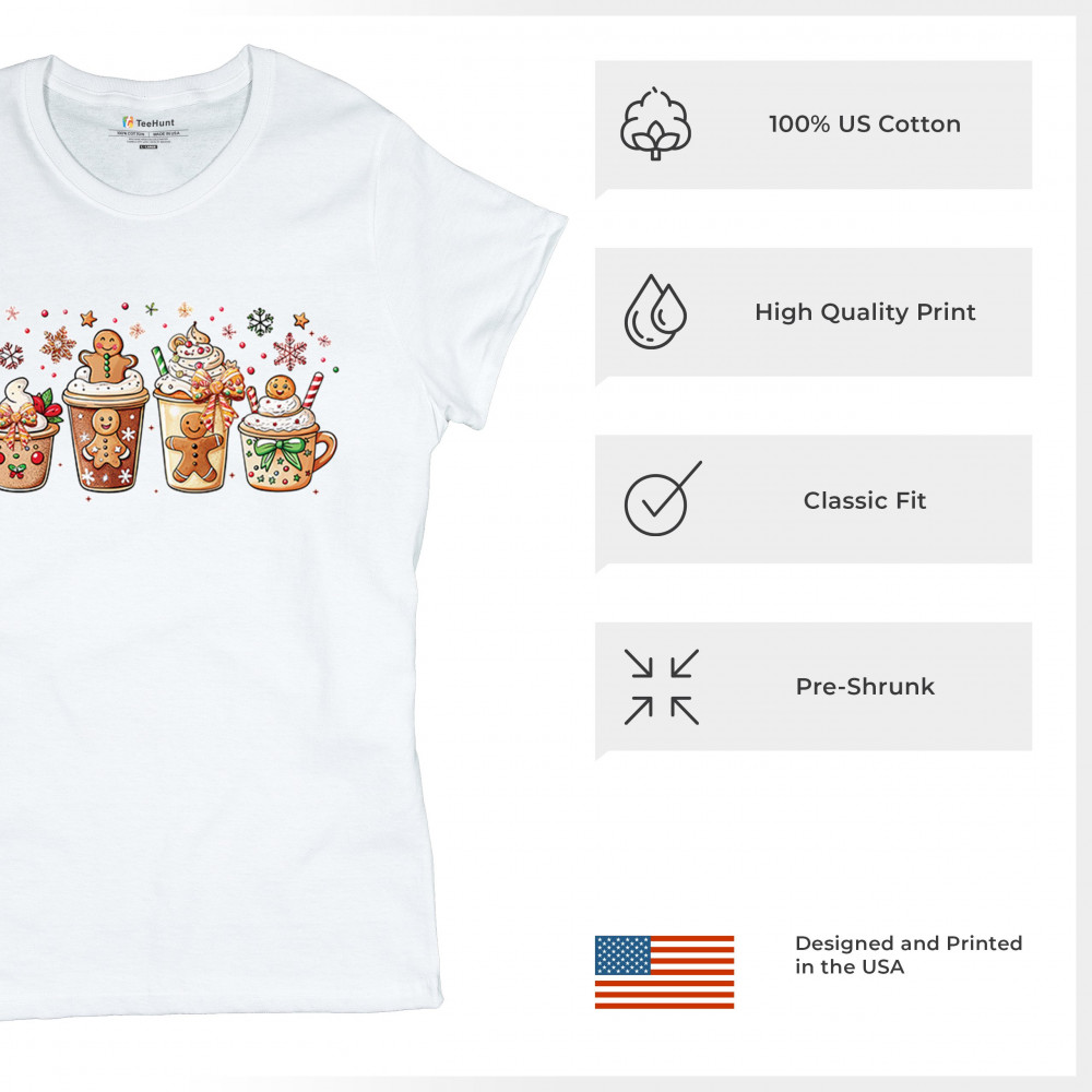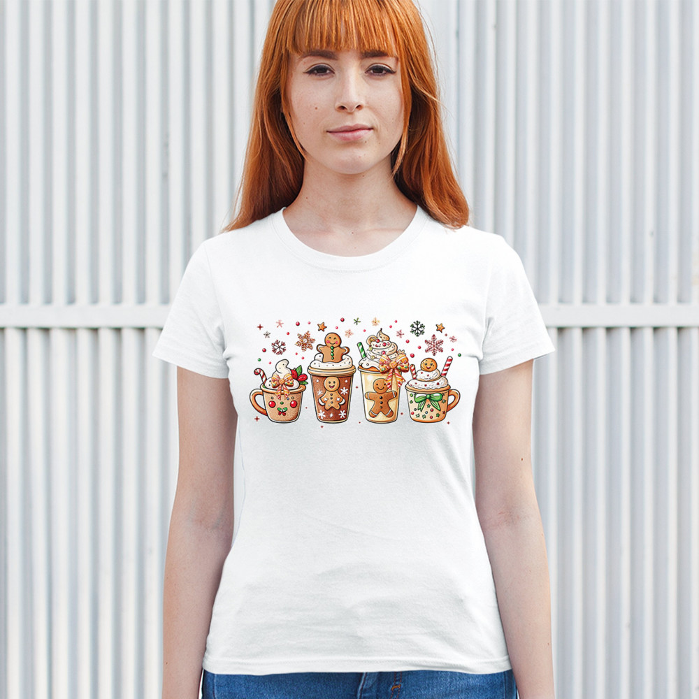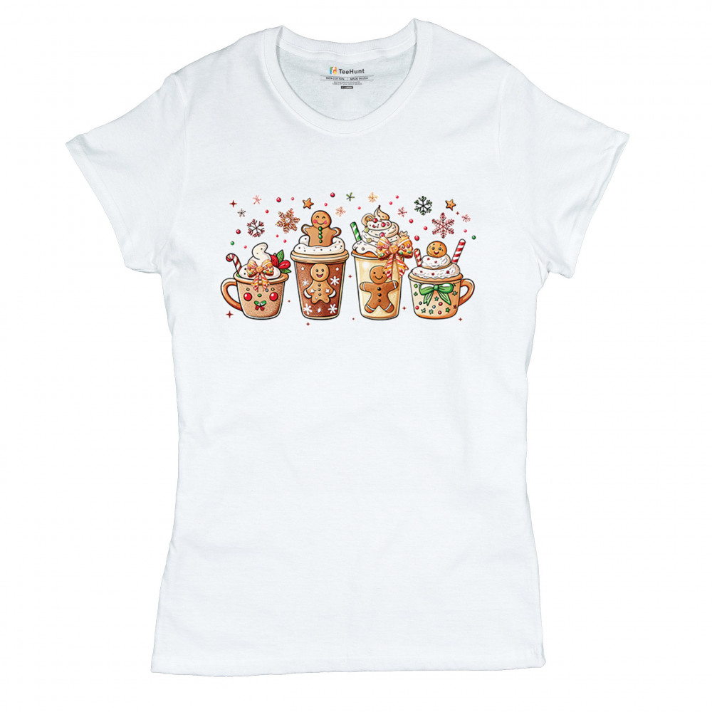 This cute Christmas drink design showcases gingerbread mugs, whipped cream, candy canes, sprinkles, and festive decorations for a warm winter aesthetic. Perfect for cocoa lovers, coffee fans, bakers, cozy holiday nights, gift exchanges, Christmas morning vibes, seasonal parties, and anyone who loves adorable dessert-inspired holiday art.