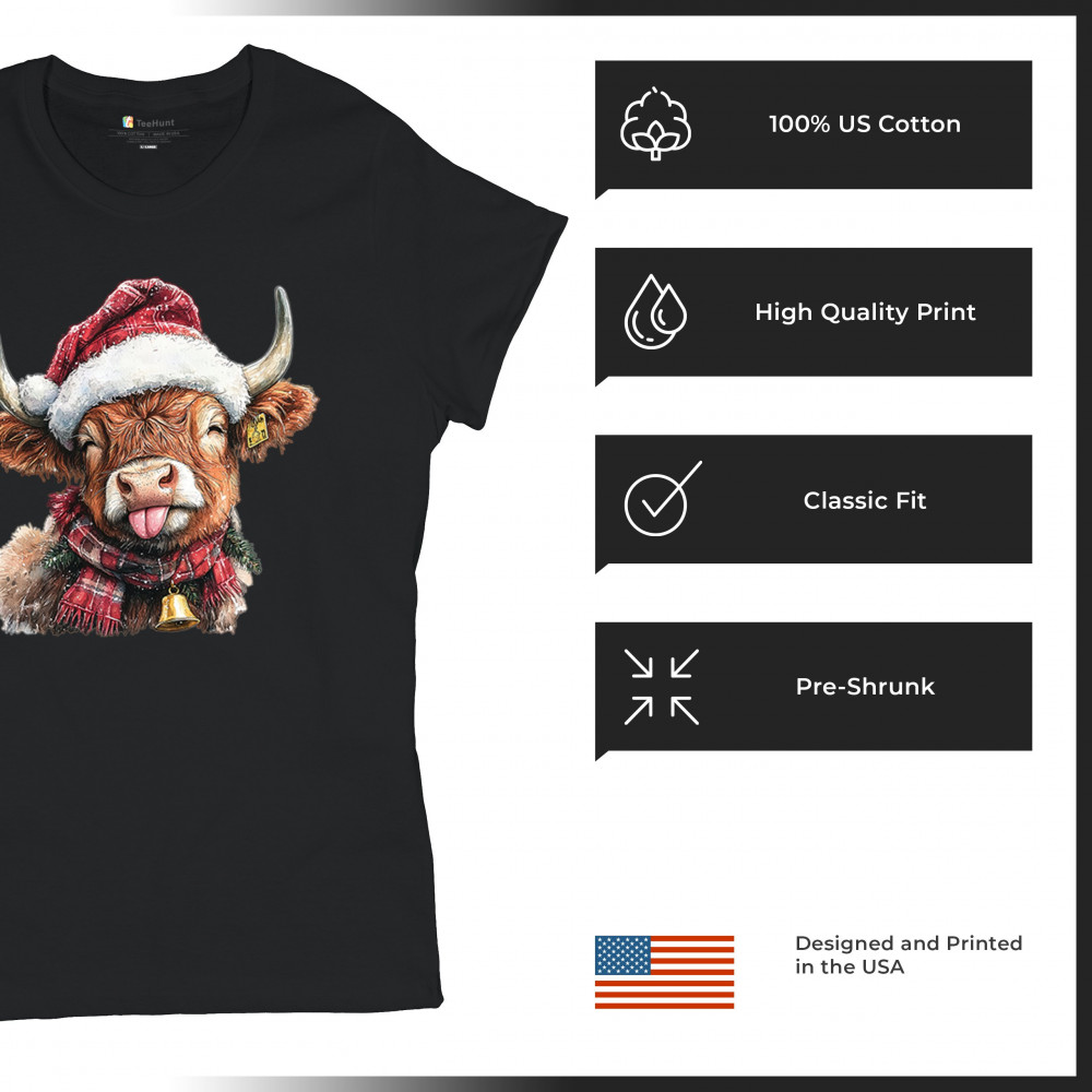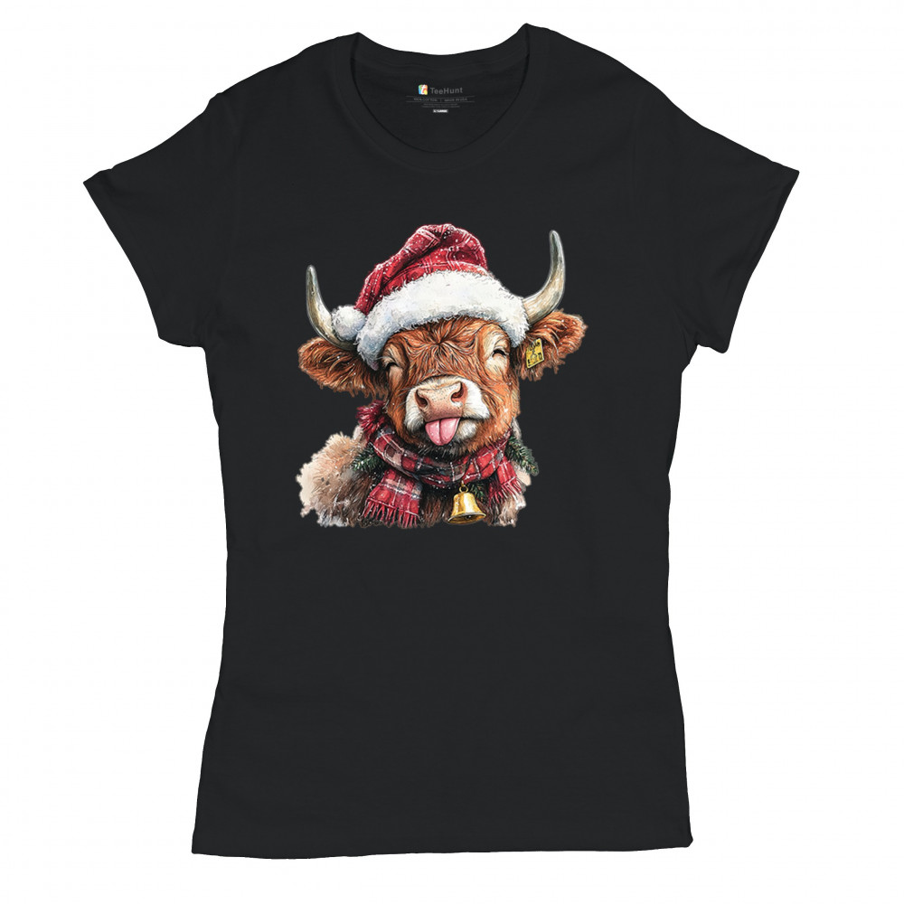 Christmas Highland Cow shirt – rustic holiday design with Santa hat cow, farmhouse holiday humor, country Christmas vibes, and festive livestock art.