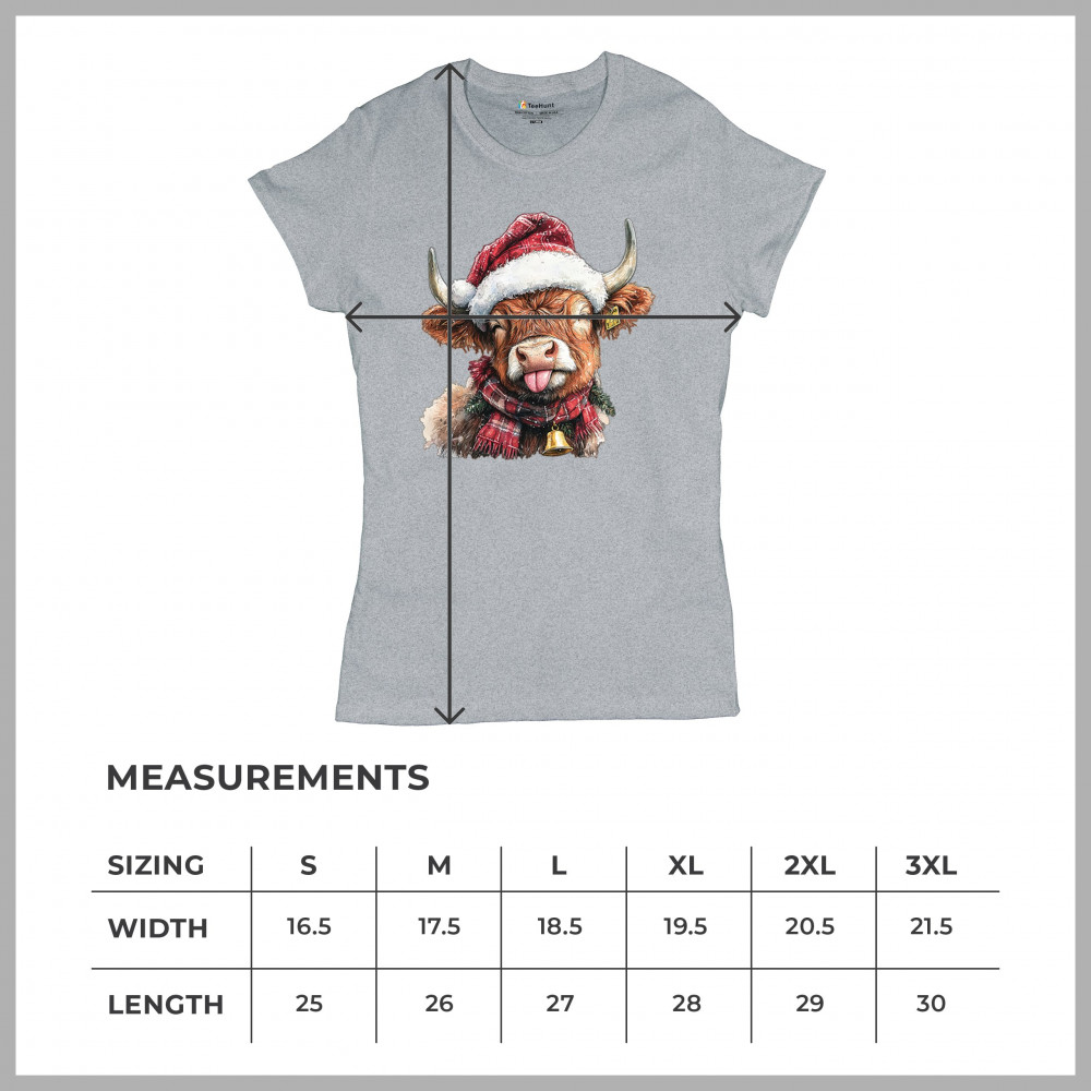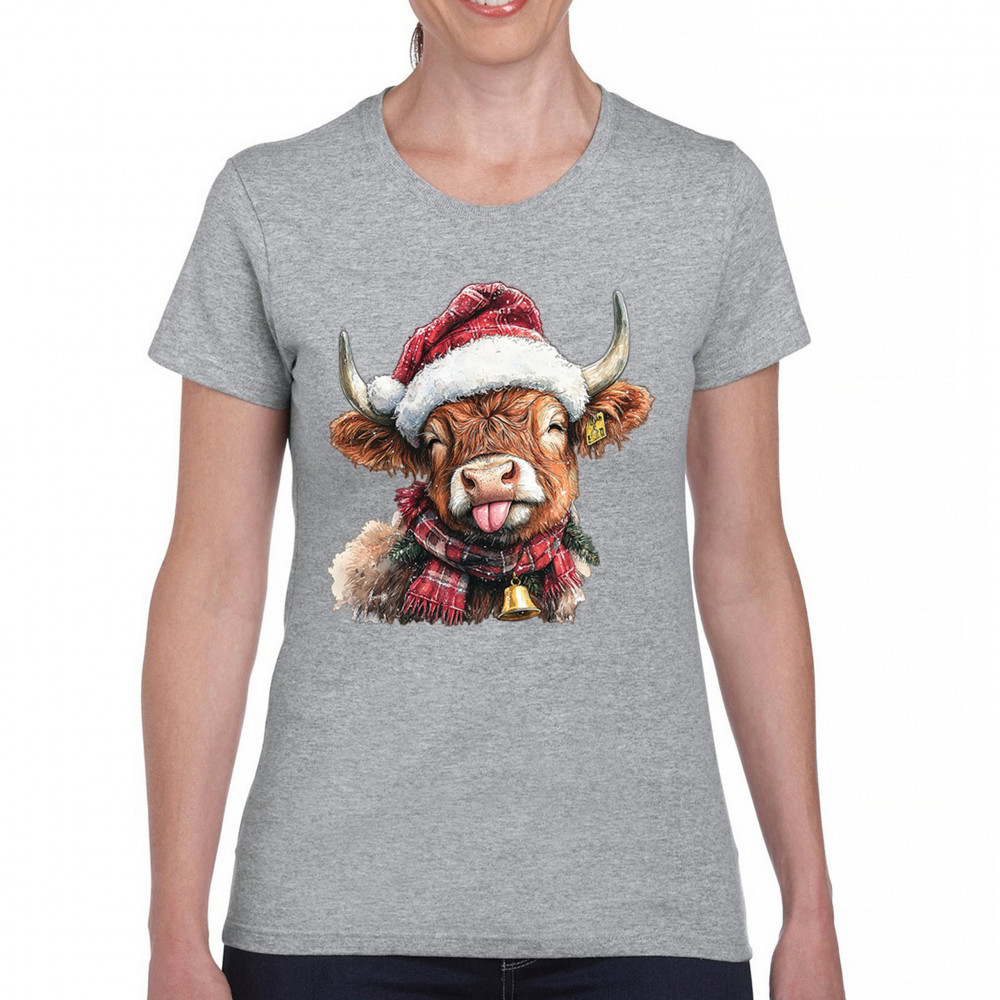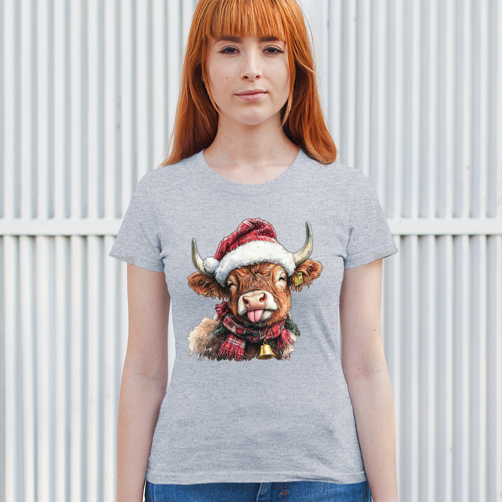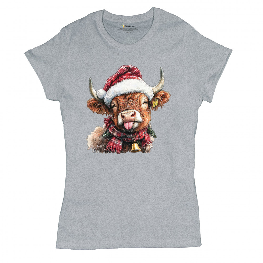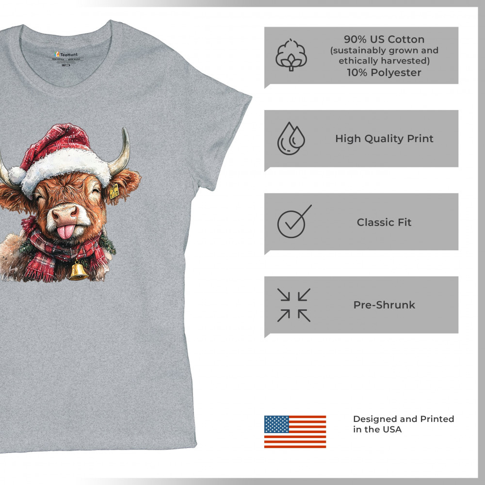 Christmas Highland Cow shirt – rustic holiday design with Santa hat cow, farmhouse holiday humor, country Christmas vibes, and festive livestock art.
