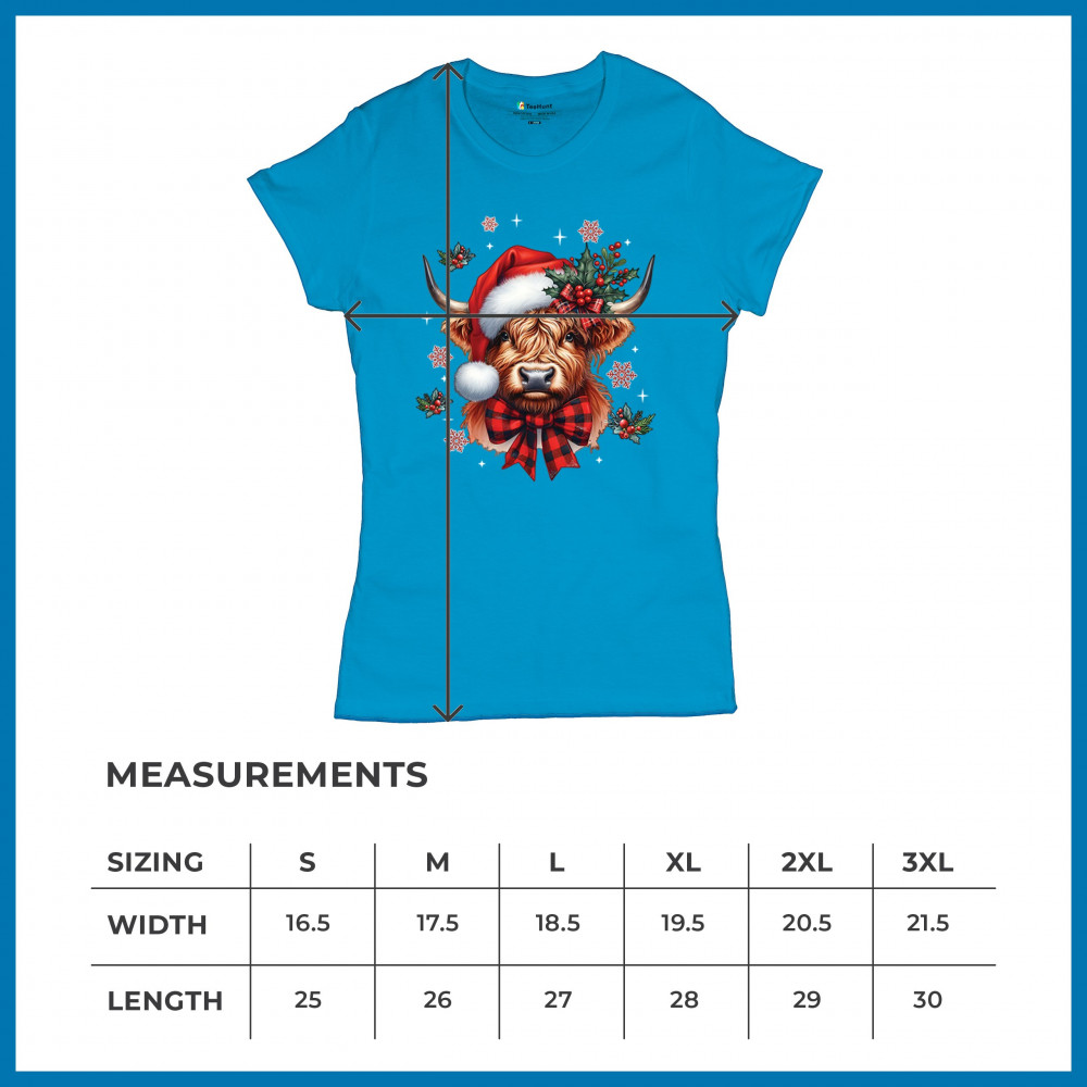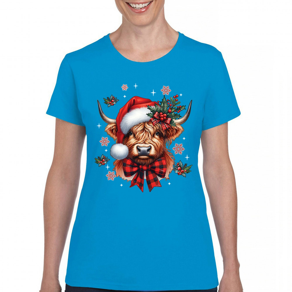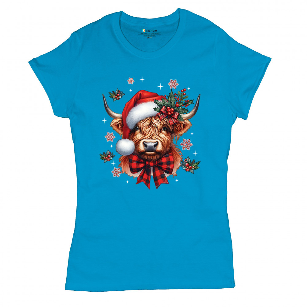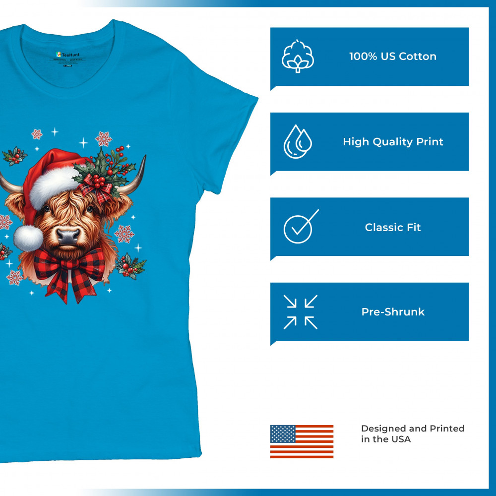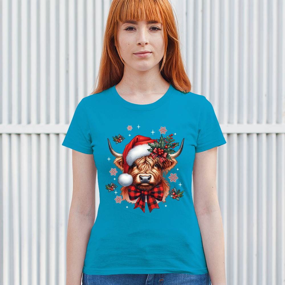 Festive Highland cow Christmas design with Santa hat, plaid bow, holly, and rustic farmhouse holiday charm. Perfect for cozy winter decor.