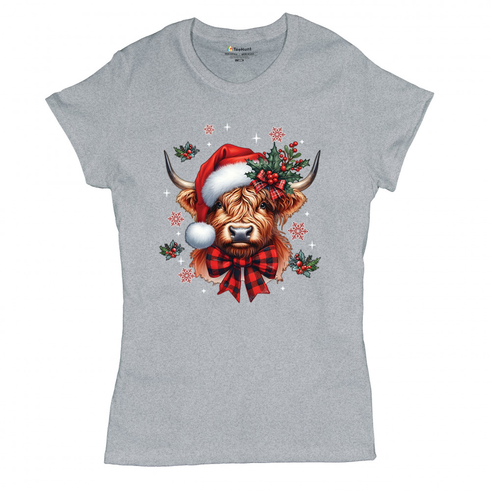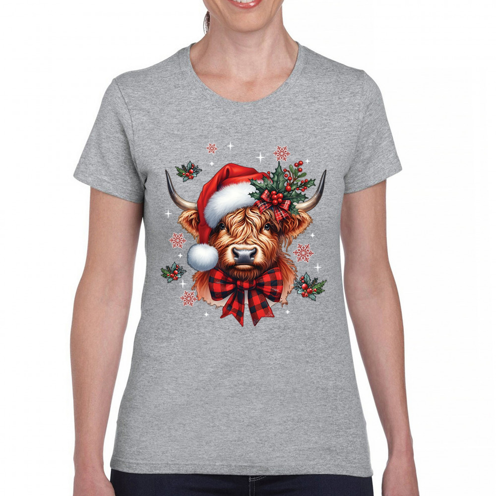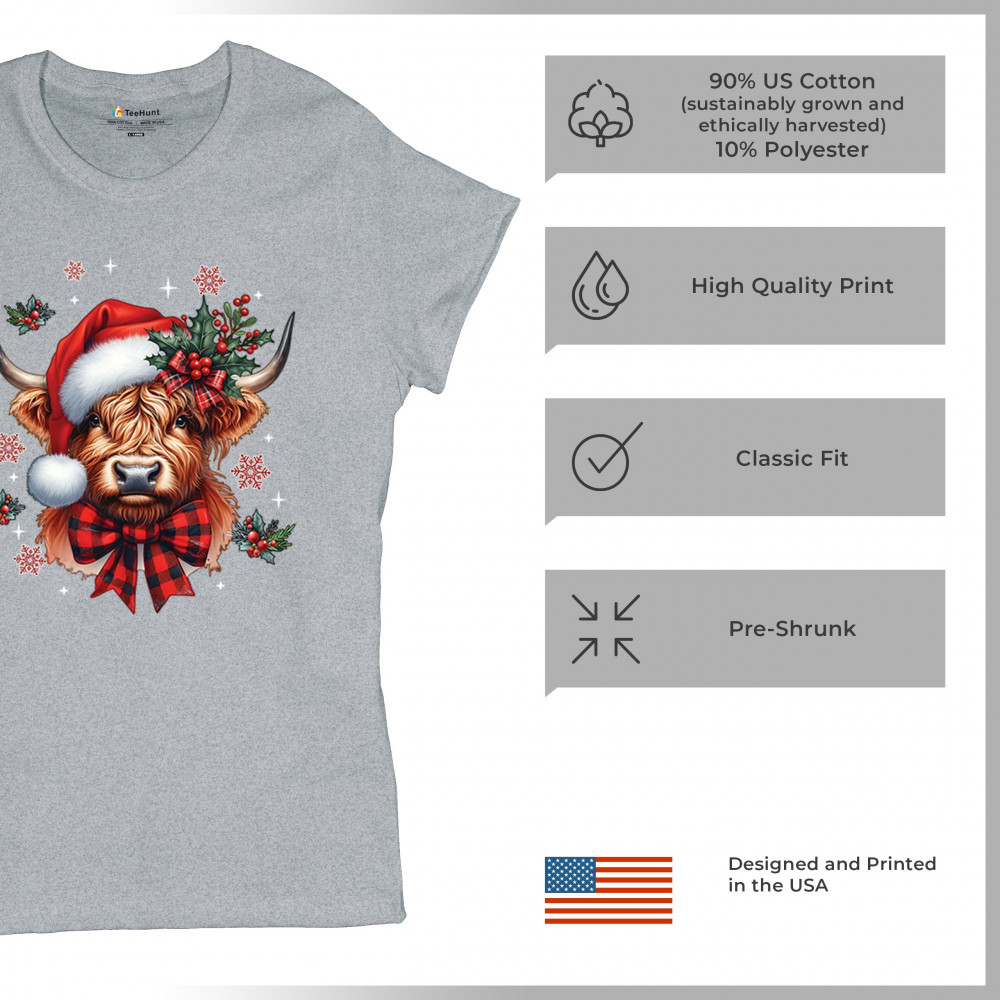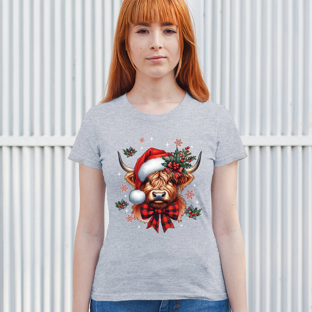 Festive Highland cow Christmas design with Santa hat, plaid bow, holly, and rustic farmhouse holiday charm. Perfect for cozy winter decor.