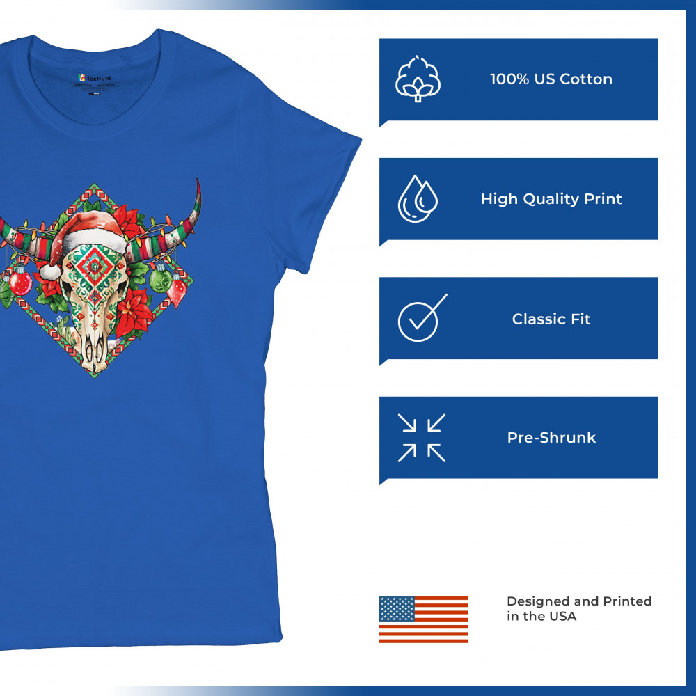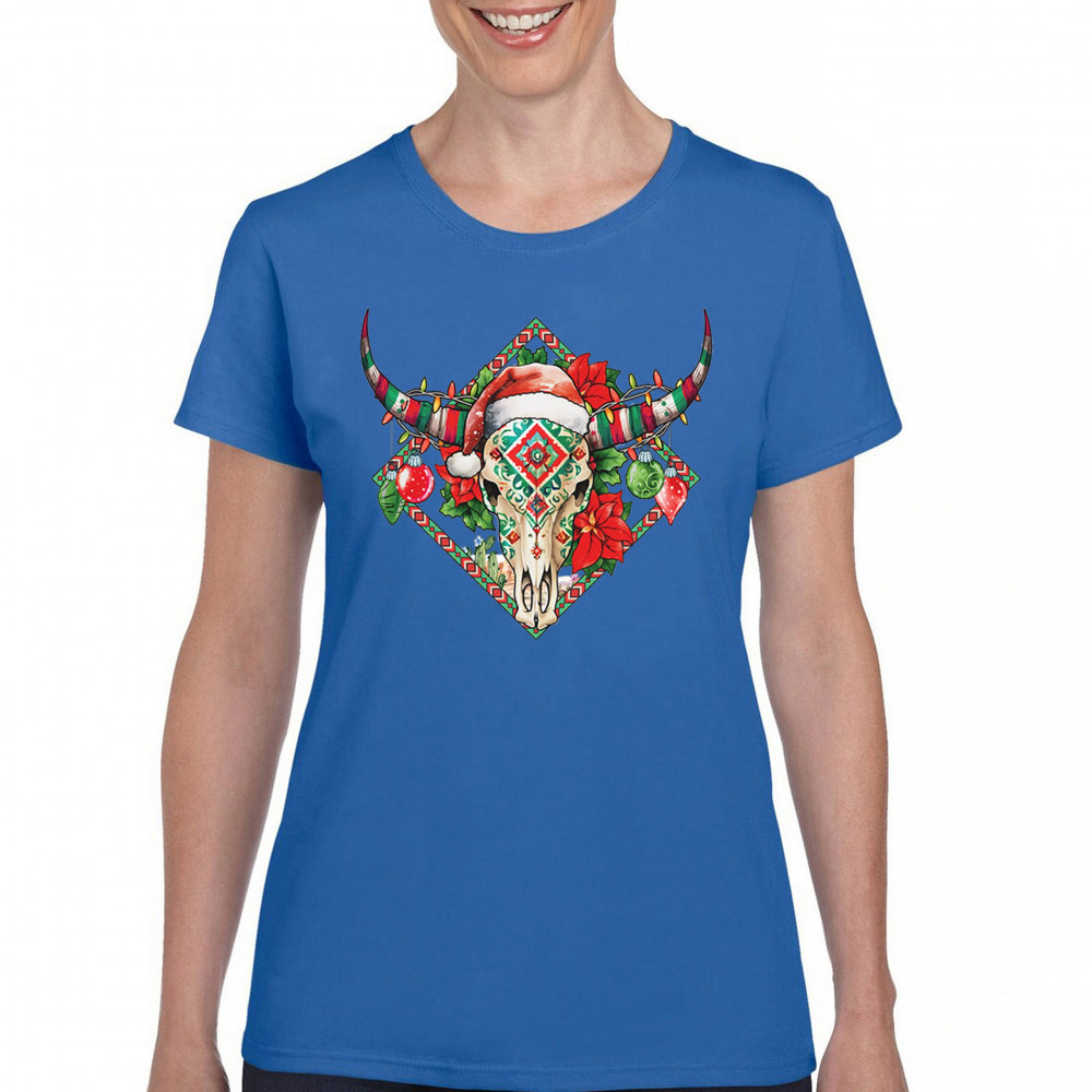 Blend Southwestern charm with holiday cheer! This vibrant skull design with poinsettias and ornaments is perfect for festive parties and unique gifts!