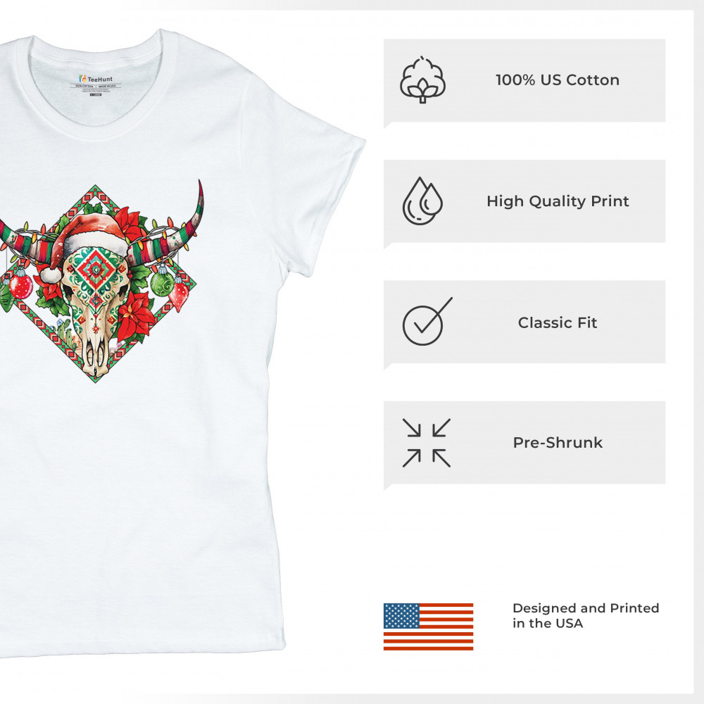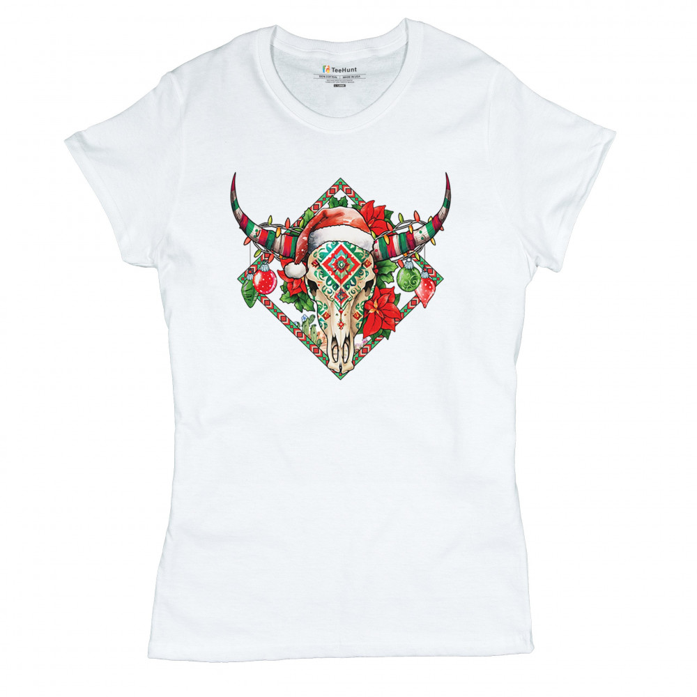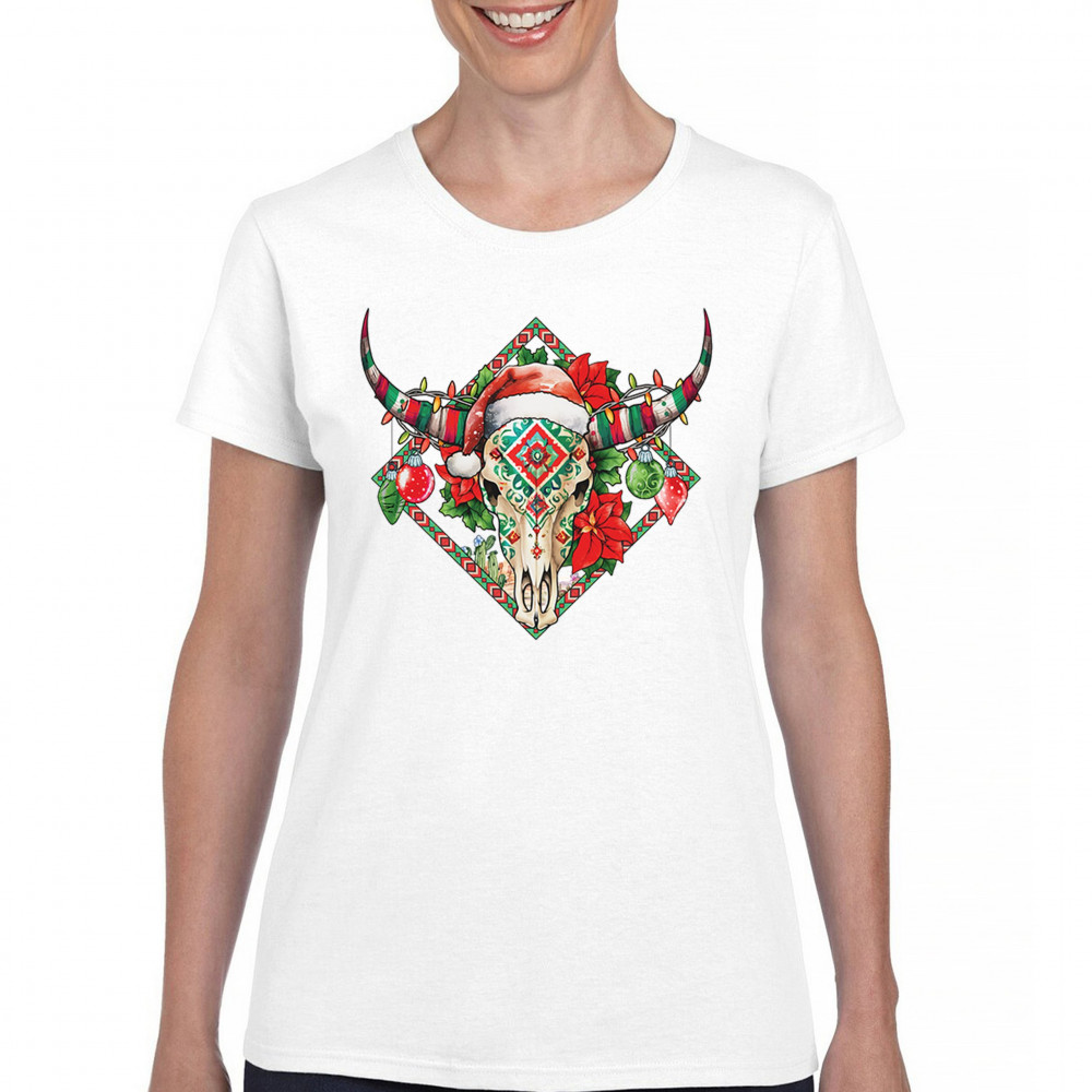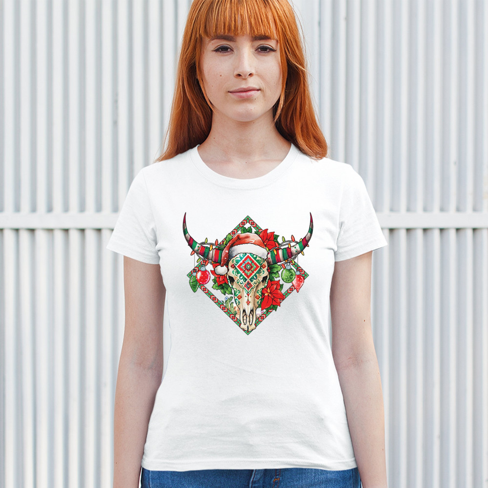 Blend Southwestern charm with holiday cheer! This vibrant skull design with poinsettias and ornaments is perfect for festive parties and unique gifts!