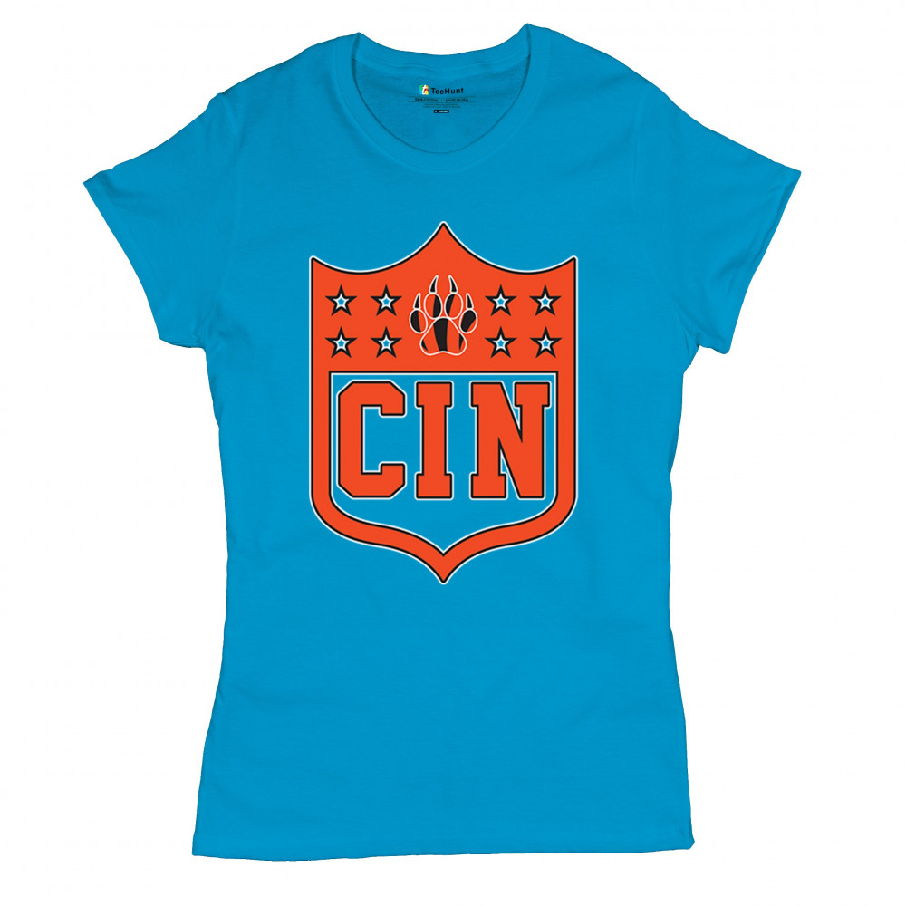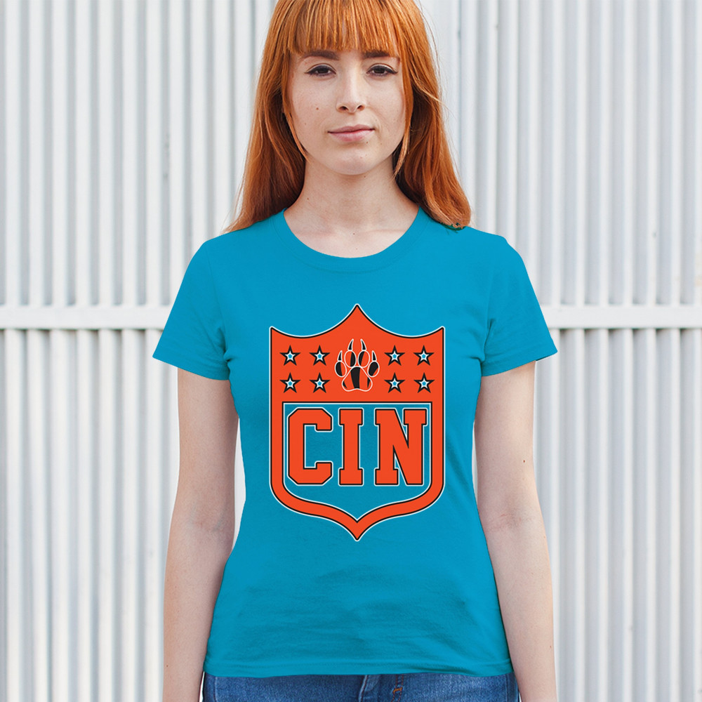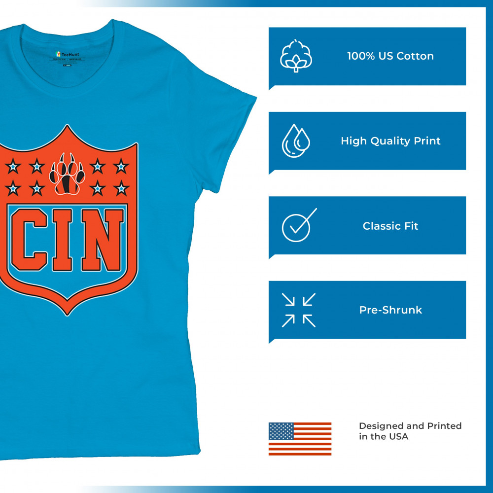 Bold CIN paw shield for Cincinnati football fans. Retro crest style, underdog spirit, and vintage game day gear for true Cincinnati grit.