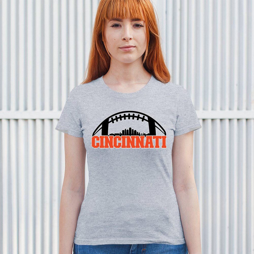 Discover the perfect blend of football passion and Cincinnati pride with this eye-catching design. Featuring the Queen City skyline under a bold football arch, this graphic is ideal for fans cheering on their team or celebrating their love for the city. Whether at a tailgate, game, or casual outing, this design lets you show your loyalty in style. A thoughtful gift for Cincinnati football enthusiasts!
