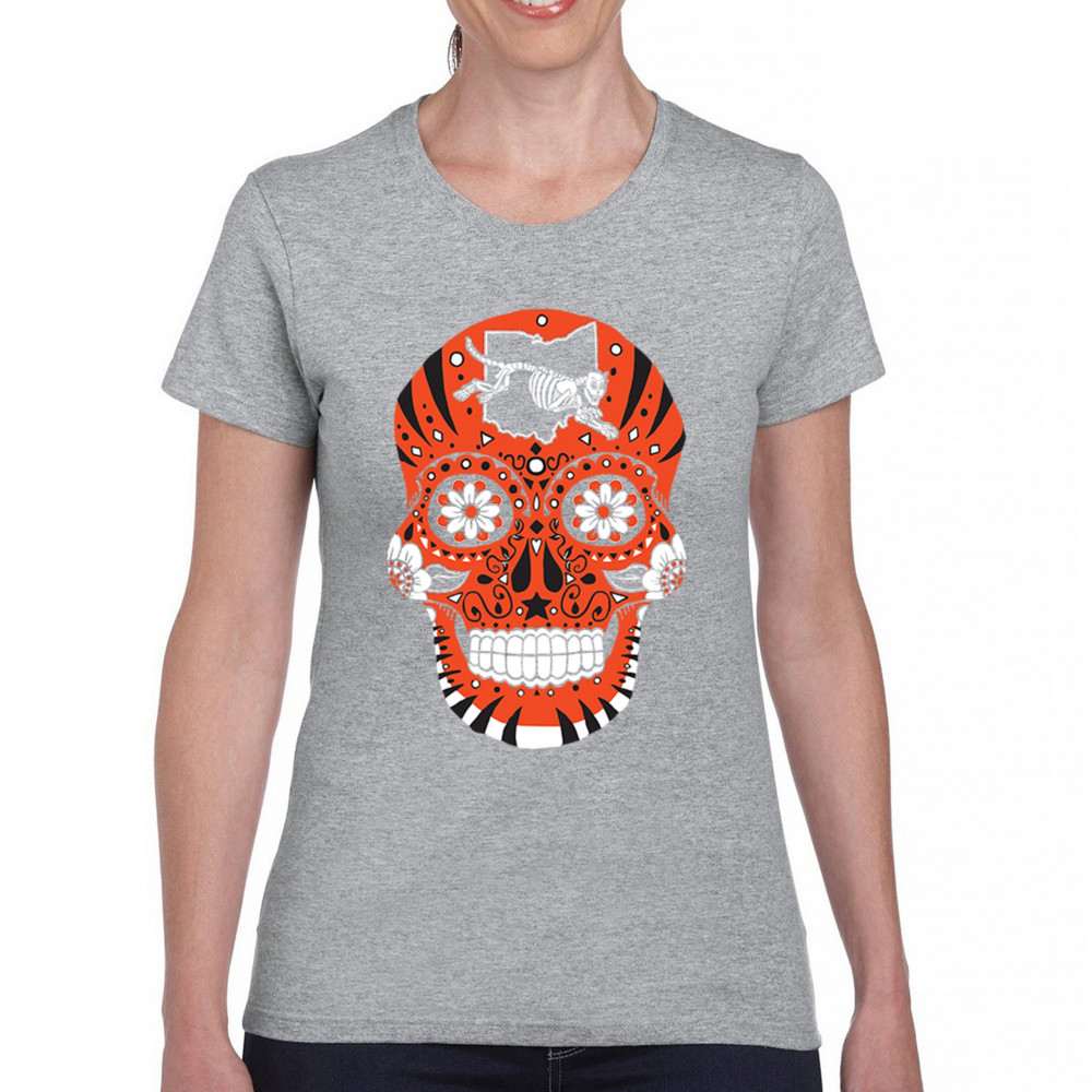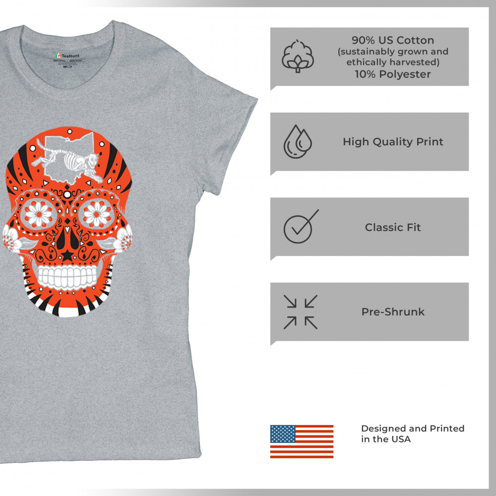 Cinci Sugar Skull with Queen City Paw, underdog grit, black & orange pride, Game Day energy, and playoff vibes.
