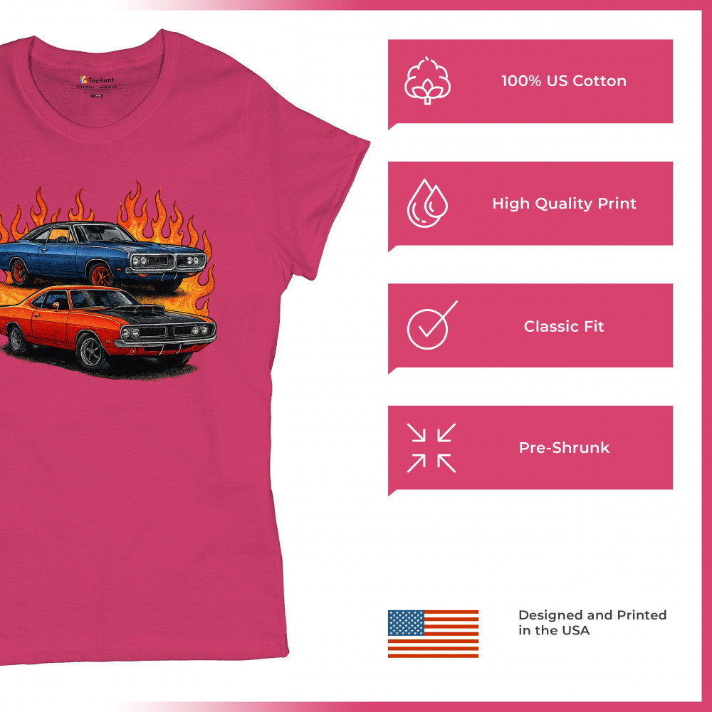Bold flame design with classic muscle cars for gearheads and vintage horsepower lovers. Perfect for shows, cruise meets, and burnout nights.