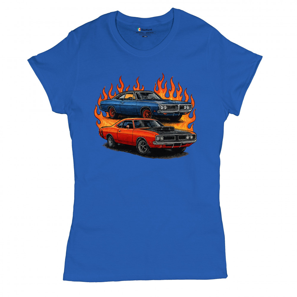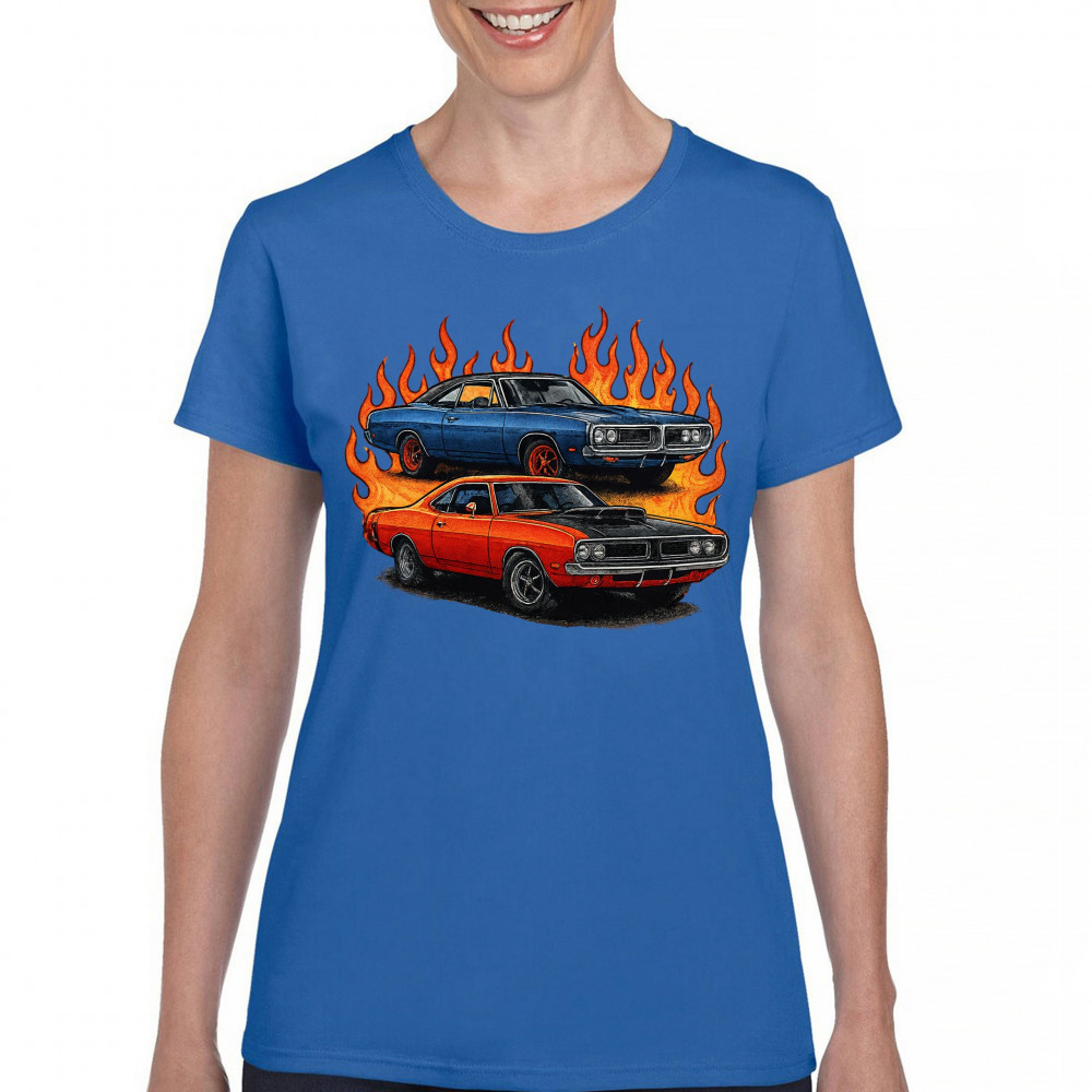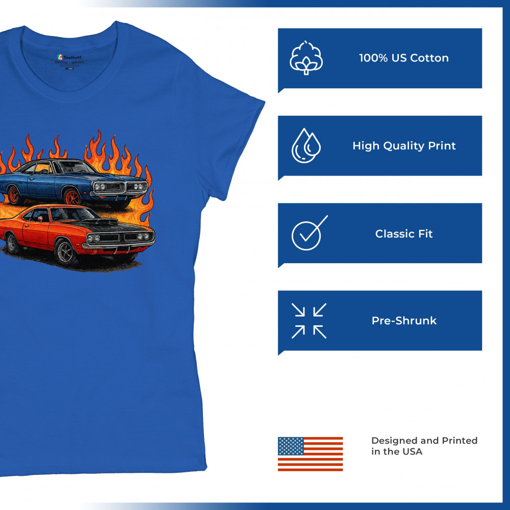 Bold flame design with classic muscle cars for gearheads and vintage horsepower lovers. Perfect for shows, cruise meets, and burnout nights.