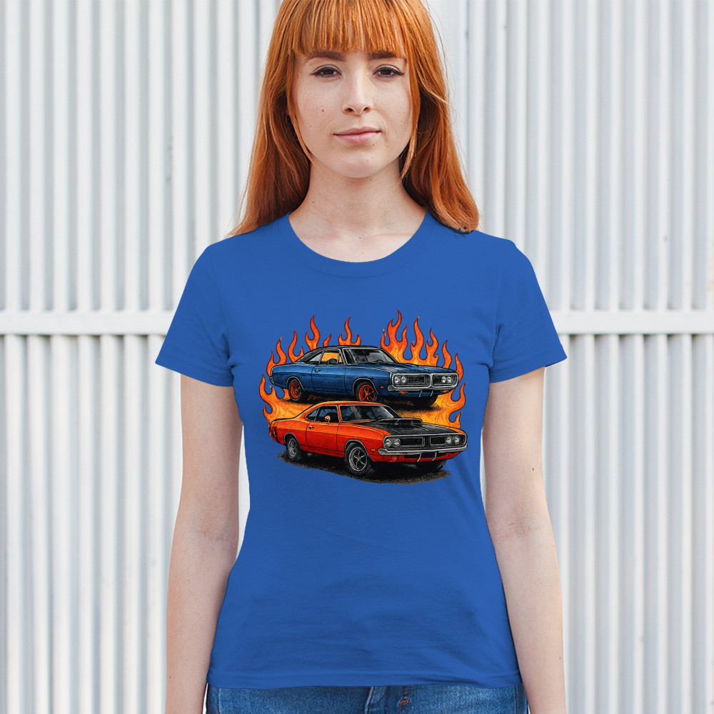 This flame-wrapped design showcases two classic muscle cars set ablaze with attitude, style, and vintage horsepower. Made for adrenaline seekers, rev heads, and car lovers who thrive on raw speed and retro fire. Whether at a burnout meet or a car show, this design lets your muscle car pride burn bright.
