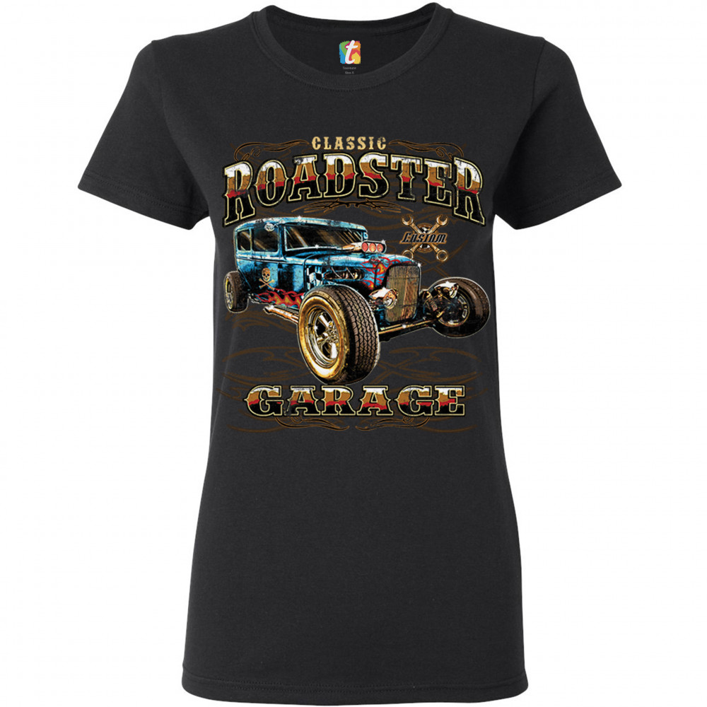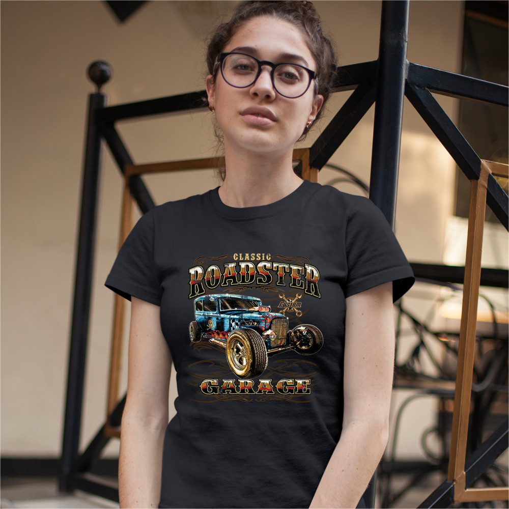 A print featuring a vintage-looking rat rod with flames and a skull with crossbones painted on it's side. "Classic Roadster" is written in the top and "Garage" in the bottom of the print. In the background there is a sign with crossed wrenches which says "custom". Great for Route 66 and hot rod fans.