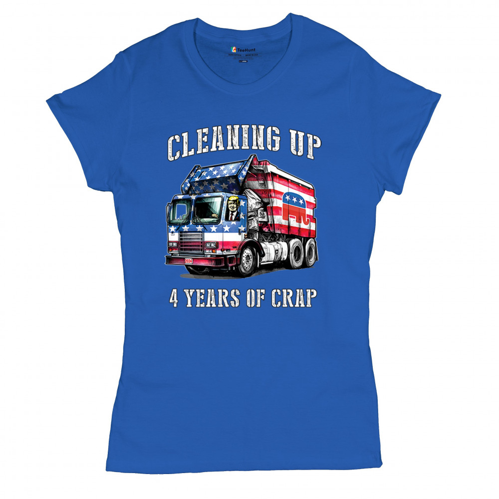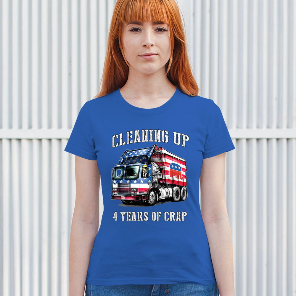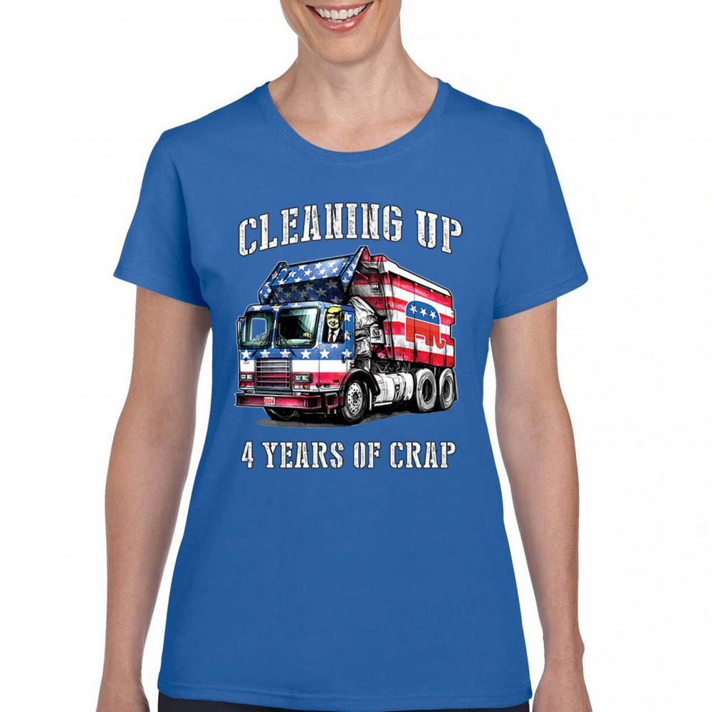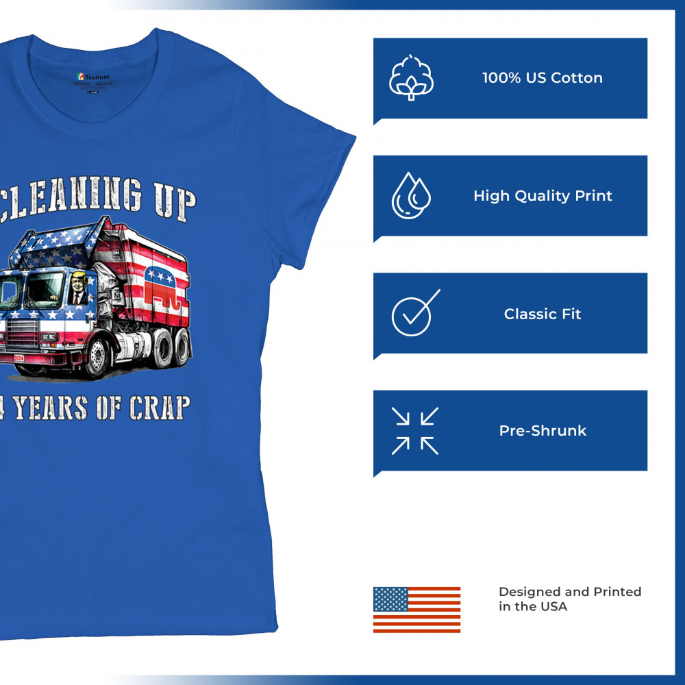 Bold "Cleaning Up 4 Years of Crap" design featuring Trump, the GOP, and the American flag. Perfect for proud conservatives and patriots.