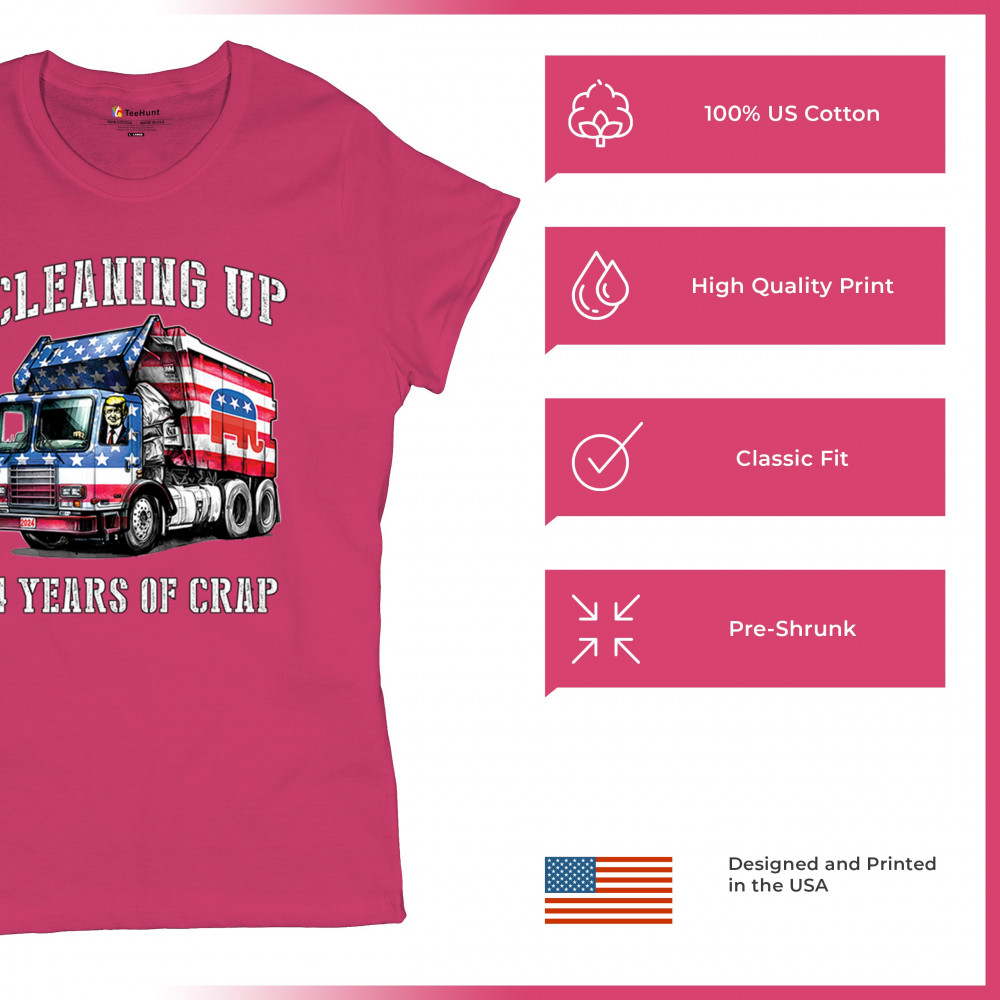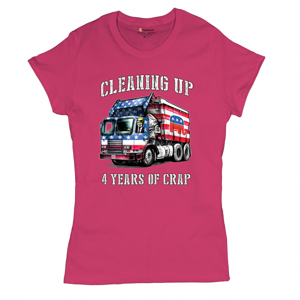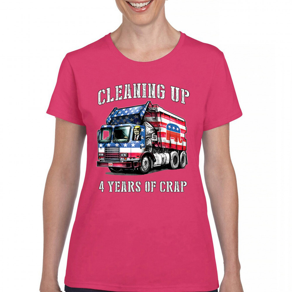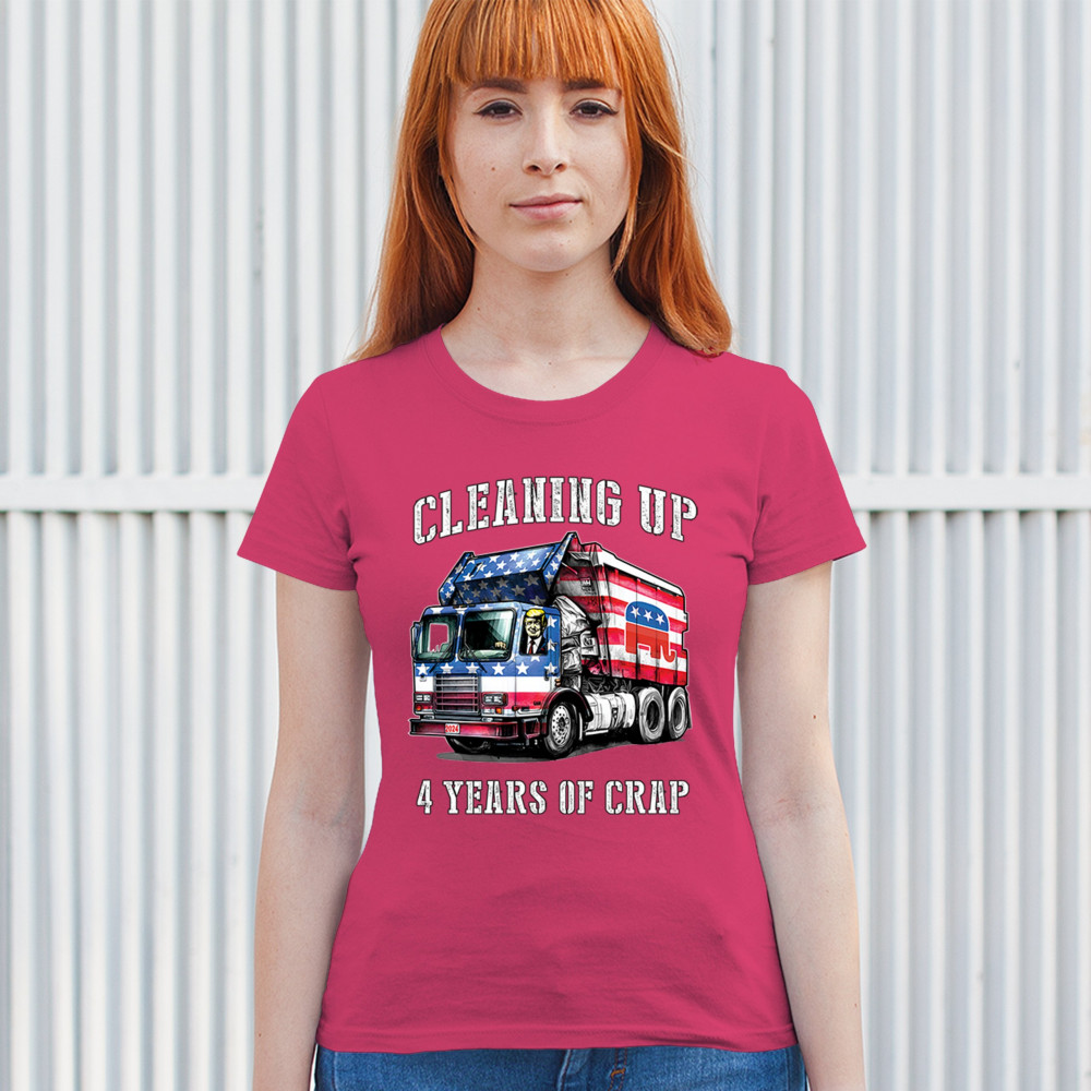Bold "Cleaning Up 4 Years of Crap" design featuring Trump, the GOP, and the American flag. Perfect for proud conservatives and patriots.