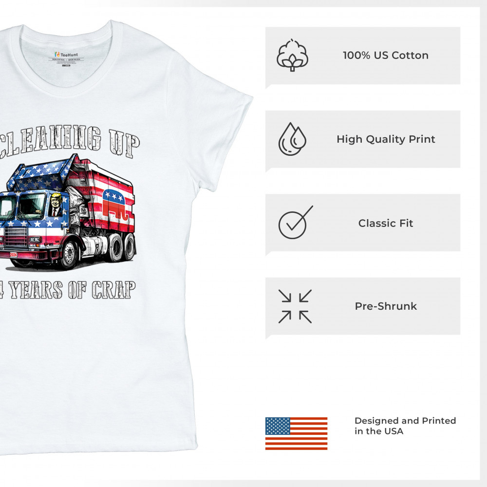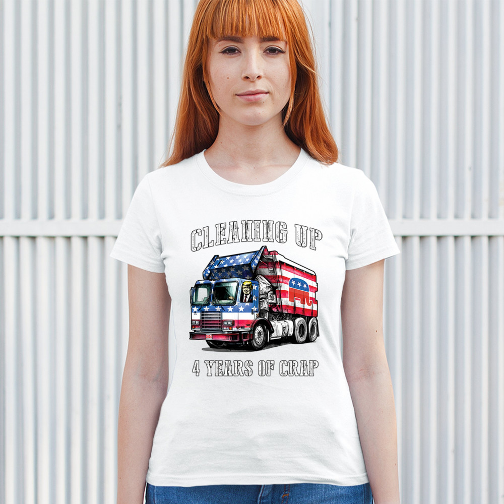 Bold "Cleaning Up 4 Years of Crap" design featuring Trump, the GOP, and the American flag. Perfect for proud conservatives and patriots.