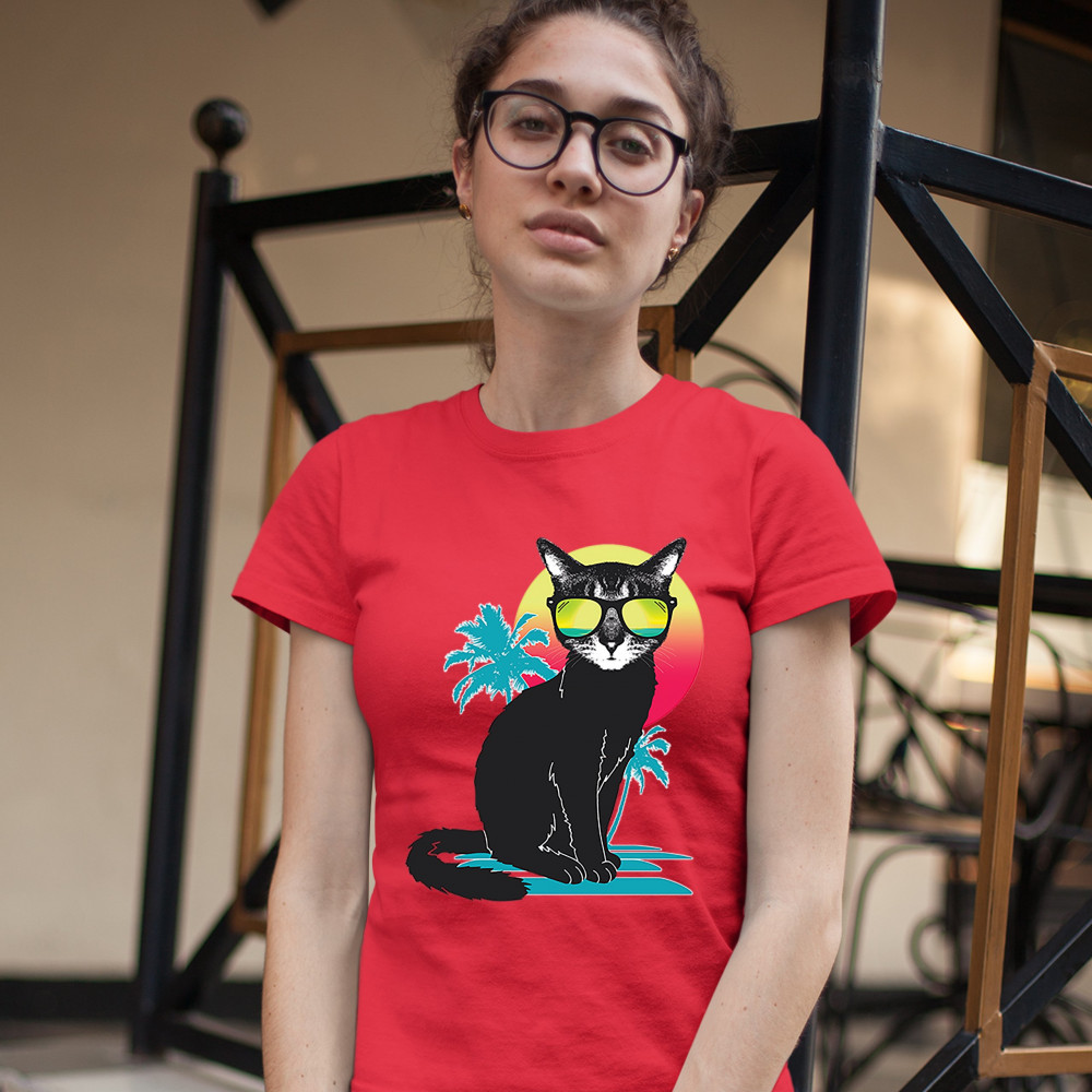 COOL SUMMER CAT t-shirt neon kitty on a beach animal lovers women's tee red