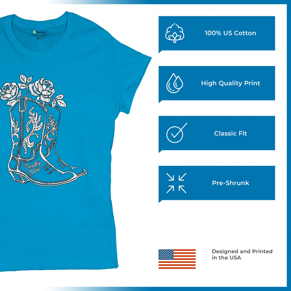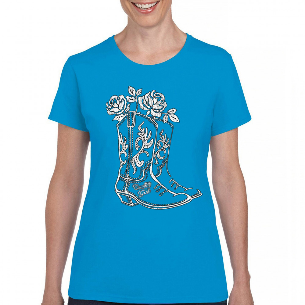 Rustic country girl design with boots and roses. Vintage western art perfect for cowgirls, rodeos, fairs, and outdoor country events.