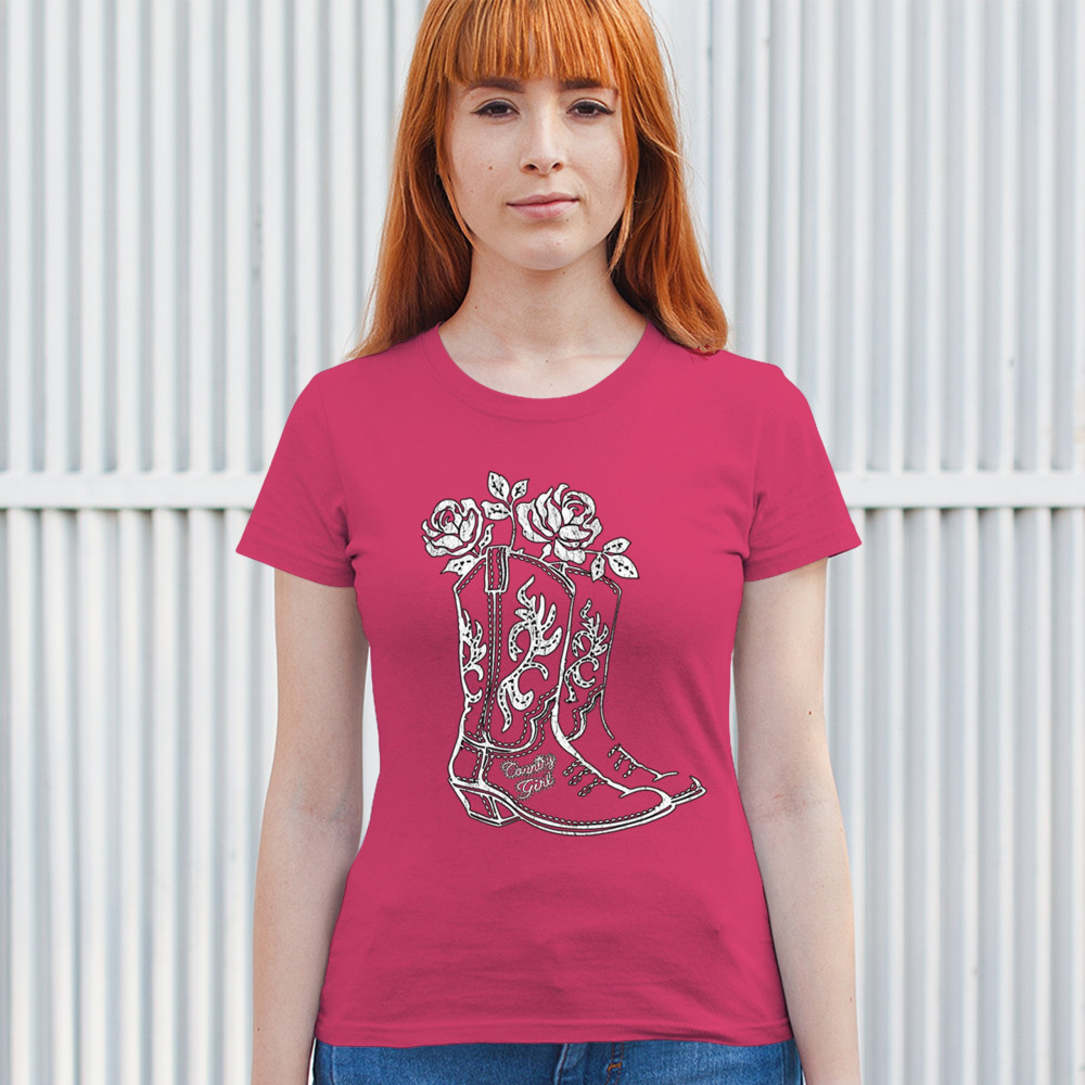 Rustic country girl design with boots and roses. Vintage western art perfect for cowgirls, rodeos, fairs, and outdoor country events.