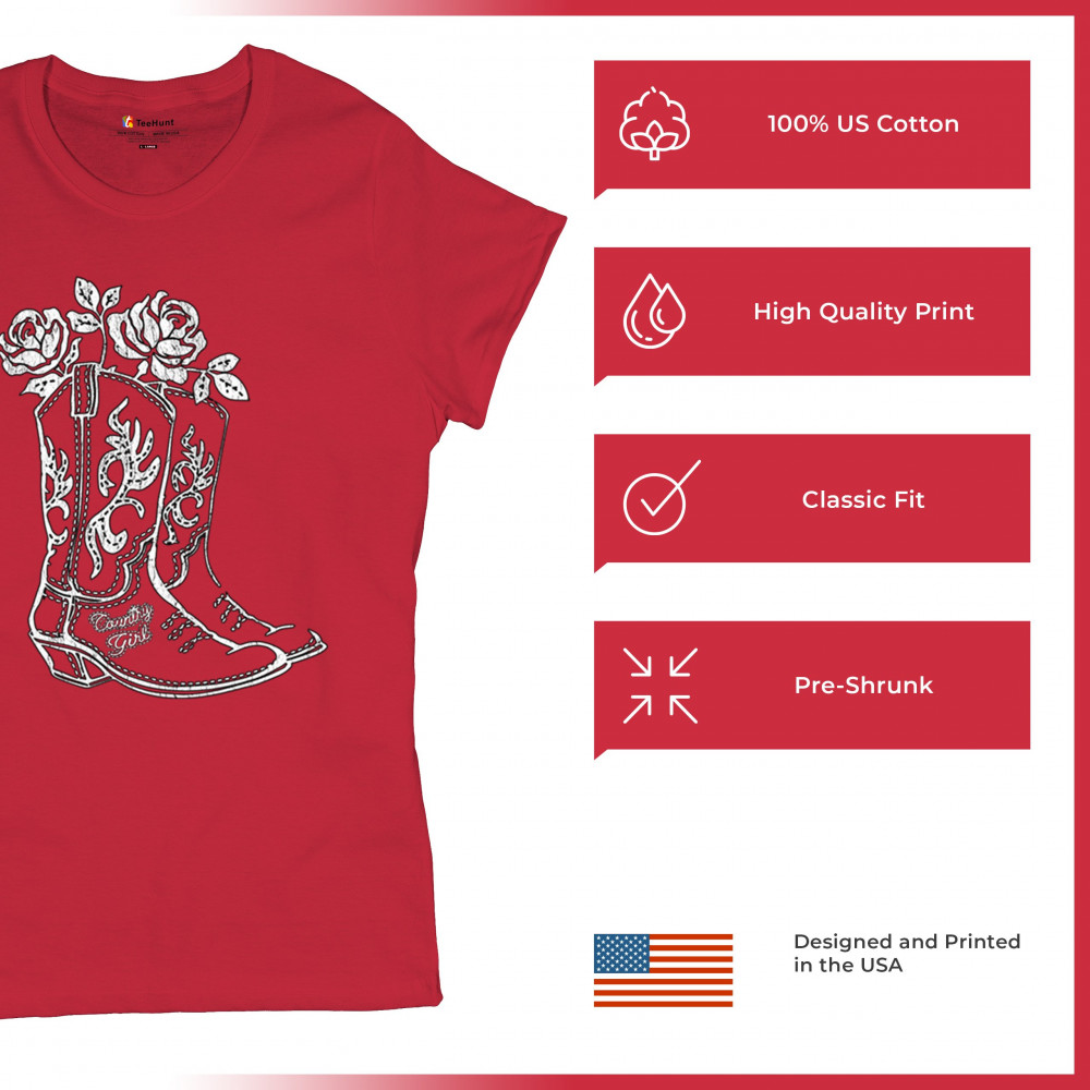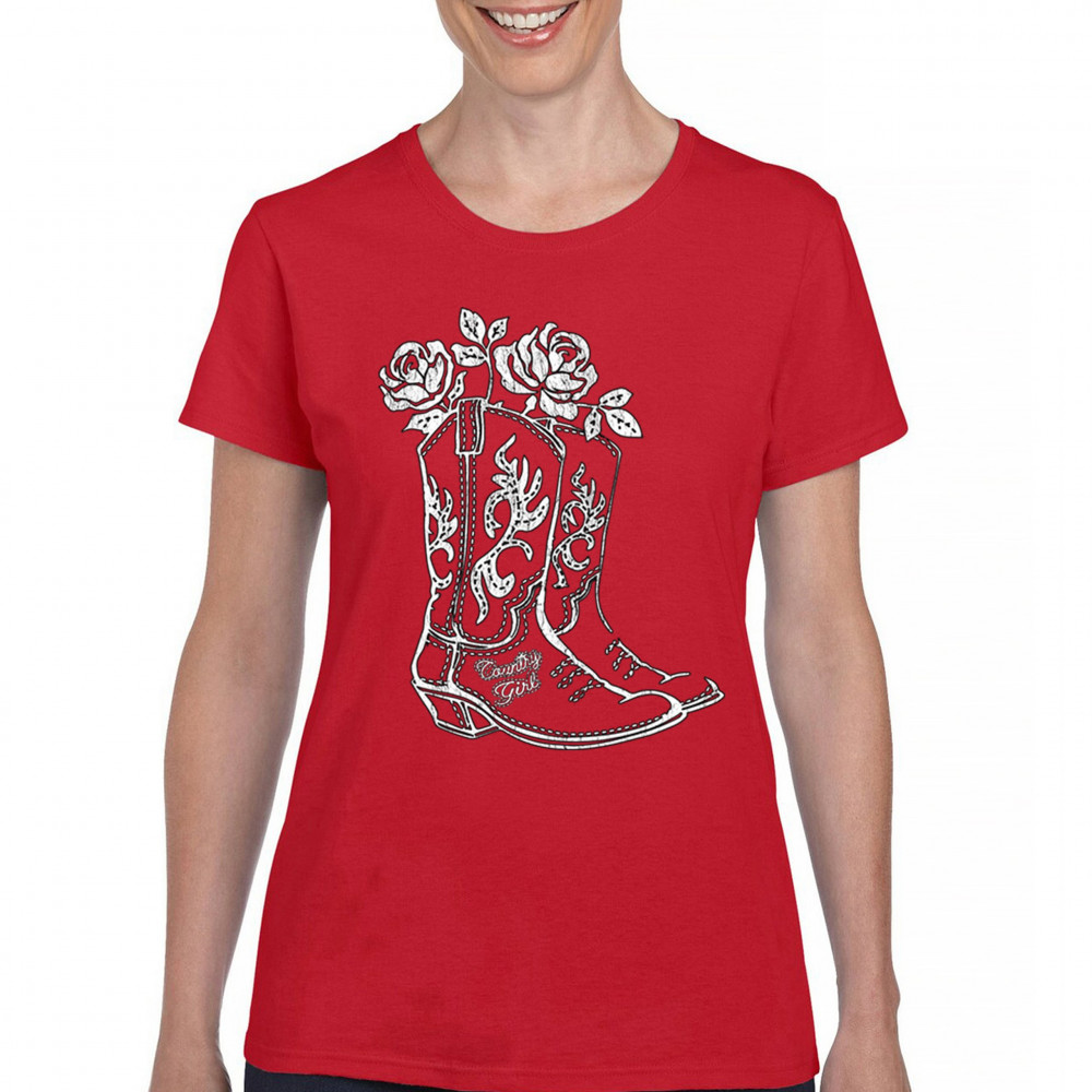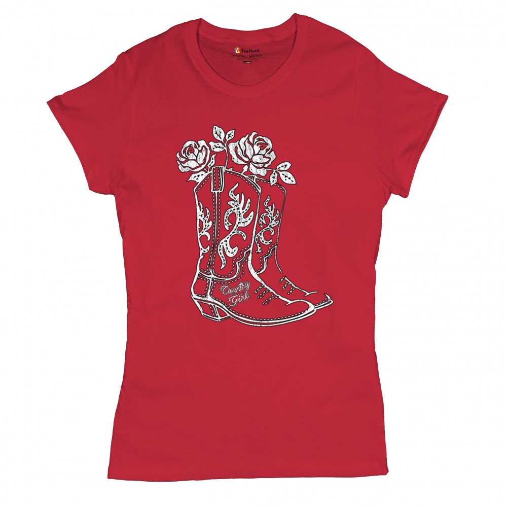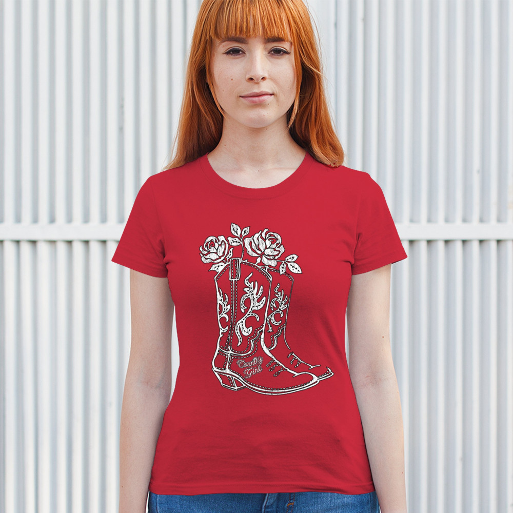 Rustic country girl design with boots and roses. Vintage western art perfect for cowgirls, rodeos, fairs, and outdoor country events.