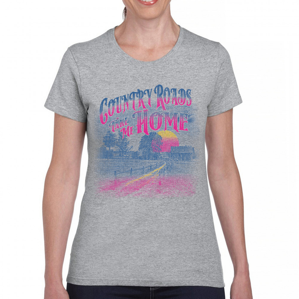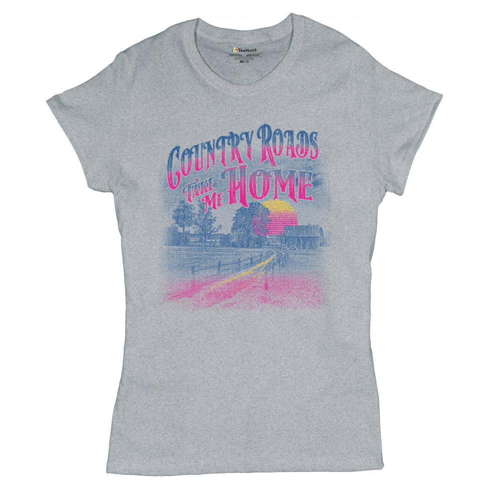 Retro sunset "Country Roads Take Me Home" design for road trip lovers, Americana fans, and country music souls. Bright, bold, and nostalgic.