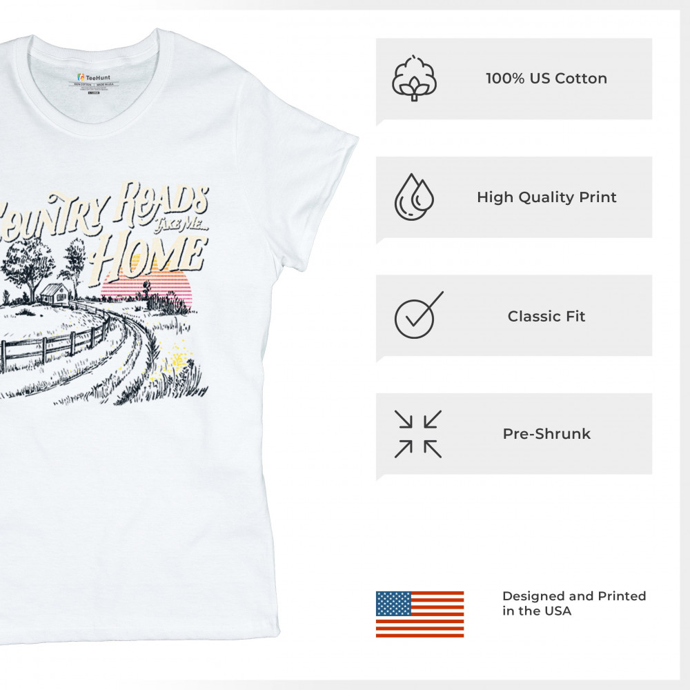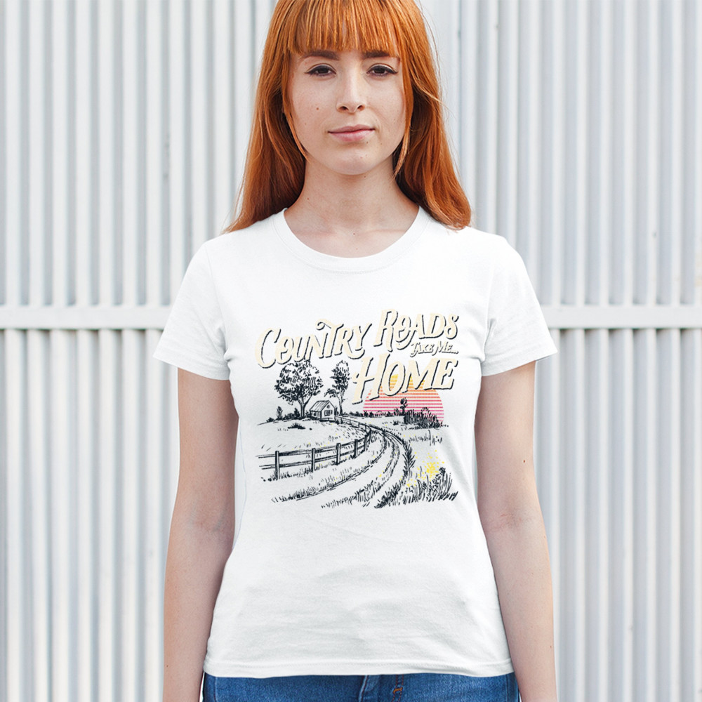 Celebrate your love for small town charm and scenic drives with this nostalgic country roads design. Featuring a bold "Take Me Home" message over a retro-styled sunset, it’s ideal for road trips, summer nights, fairs, concerts, and rural adventures. Let your wanderlust and country soul shine in every mile.