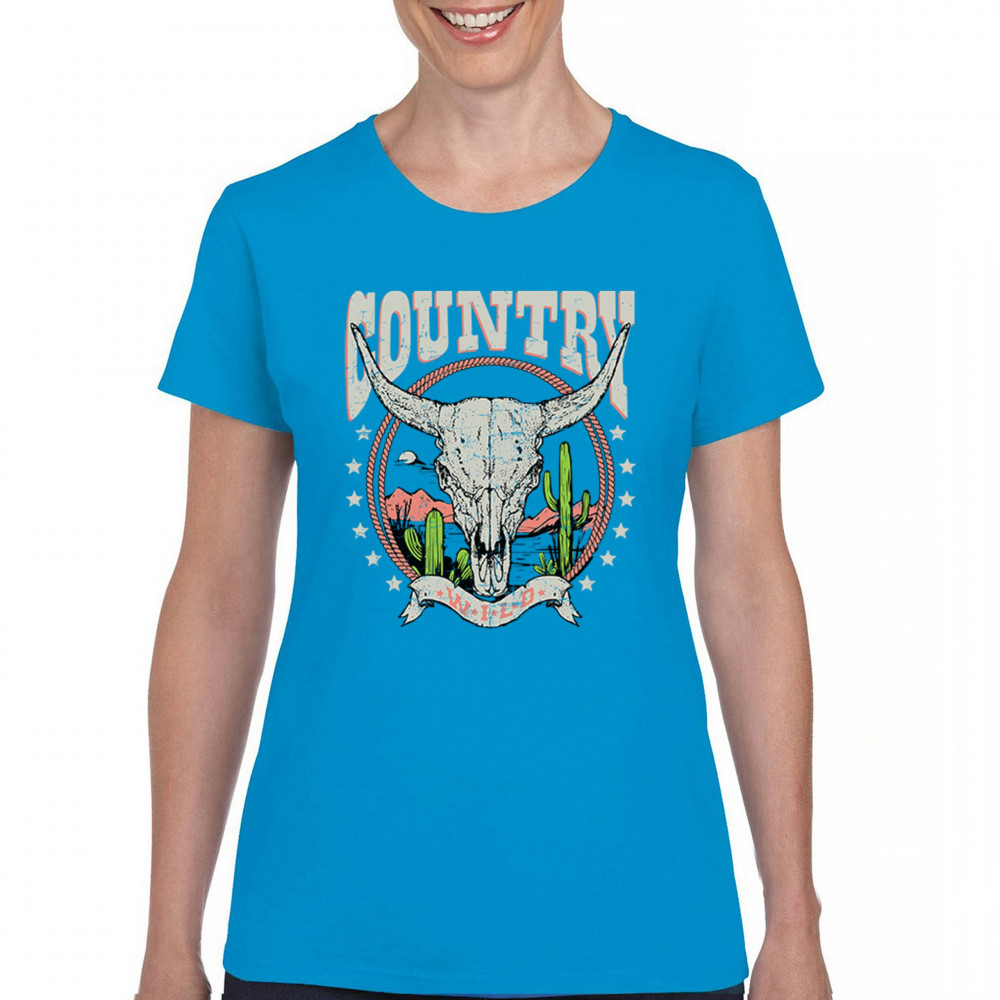 Country Wild features a steer skull with desert flair, perfect for rodeo cowboys, barn dances, country roots, and wild western spirit.