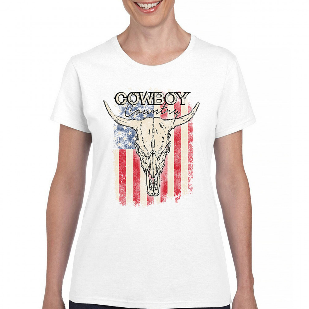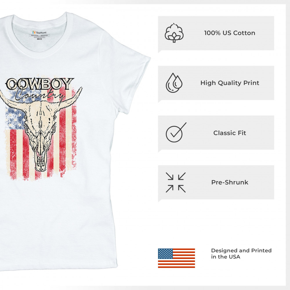 Cowboy Country steer skull design fuses rustic Americana, rodeo style, western heritage, and desert vibes for true frontier spirit.