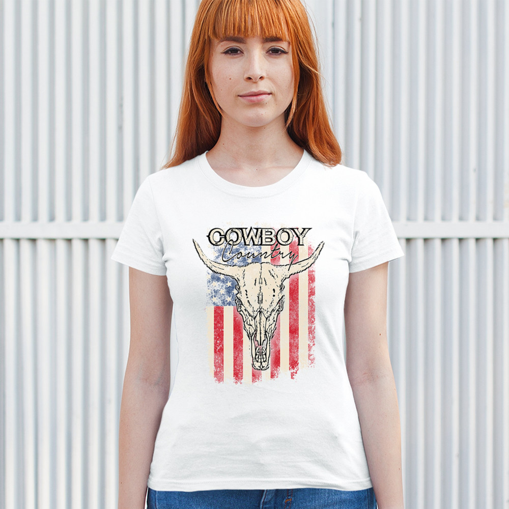 Celebrate western heritage with the Cowboy Country steer skull design, layered over a distressed American flag. This artwork embodies rustic Americana, rodeo style, and desert vibes. Perfect for cowboy décor lovers, ranch life enthusiasts, and those drawn to the wild west’s grit and prairie aesthetic. Wear your frontier spirit proudly.