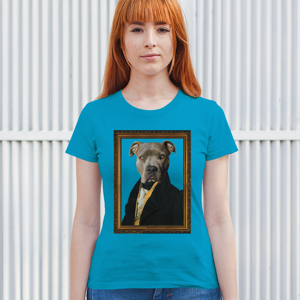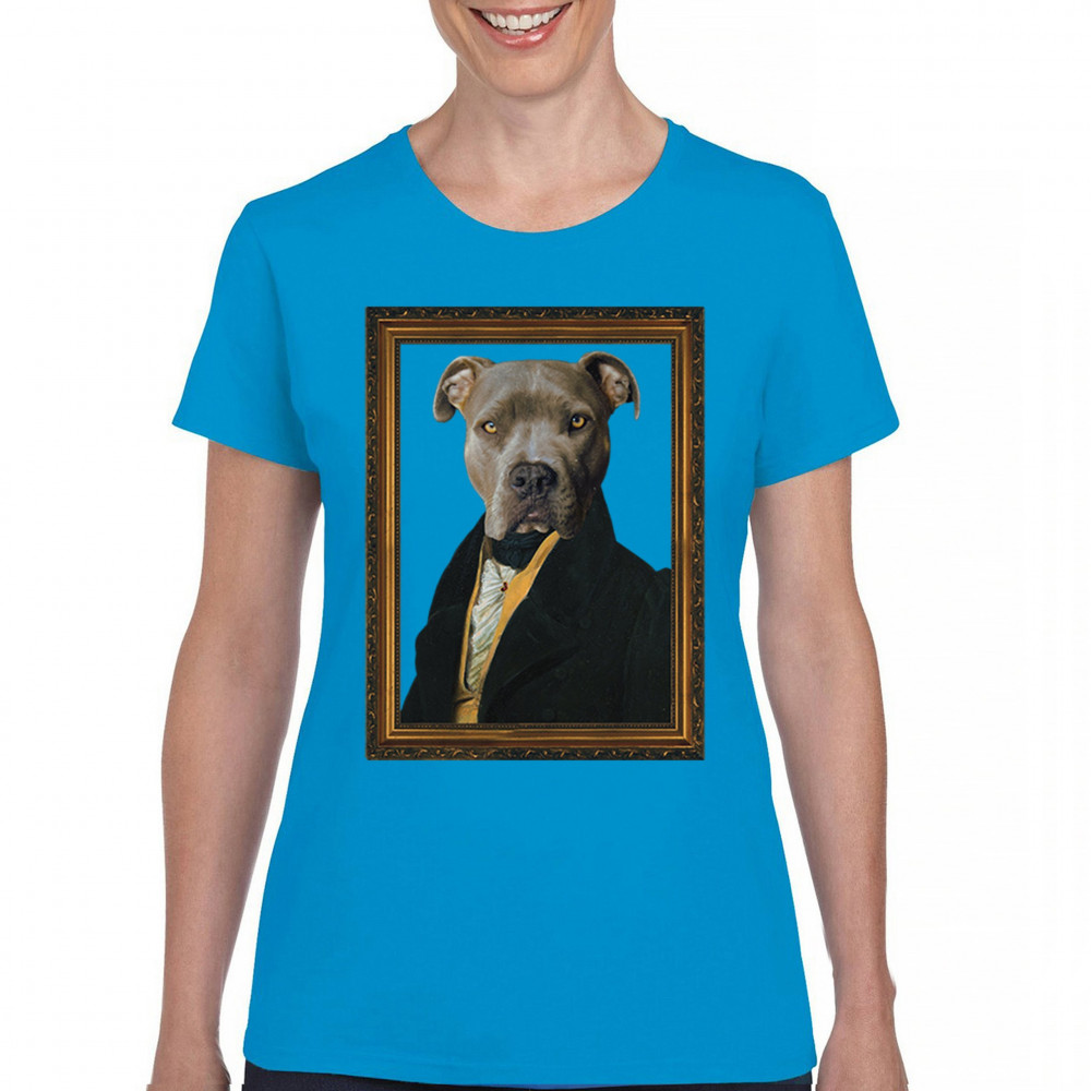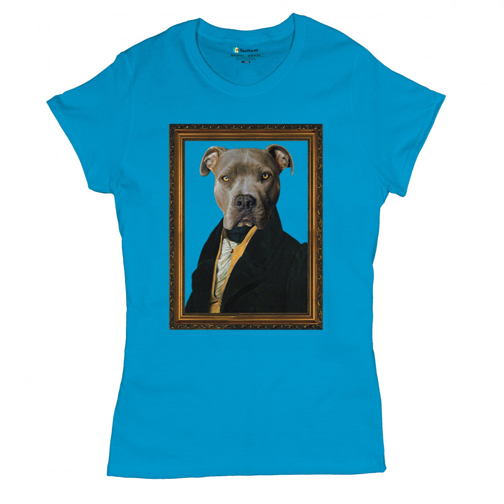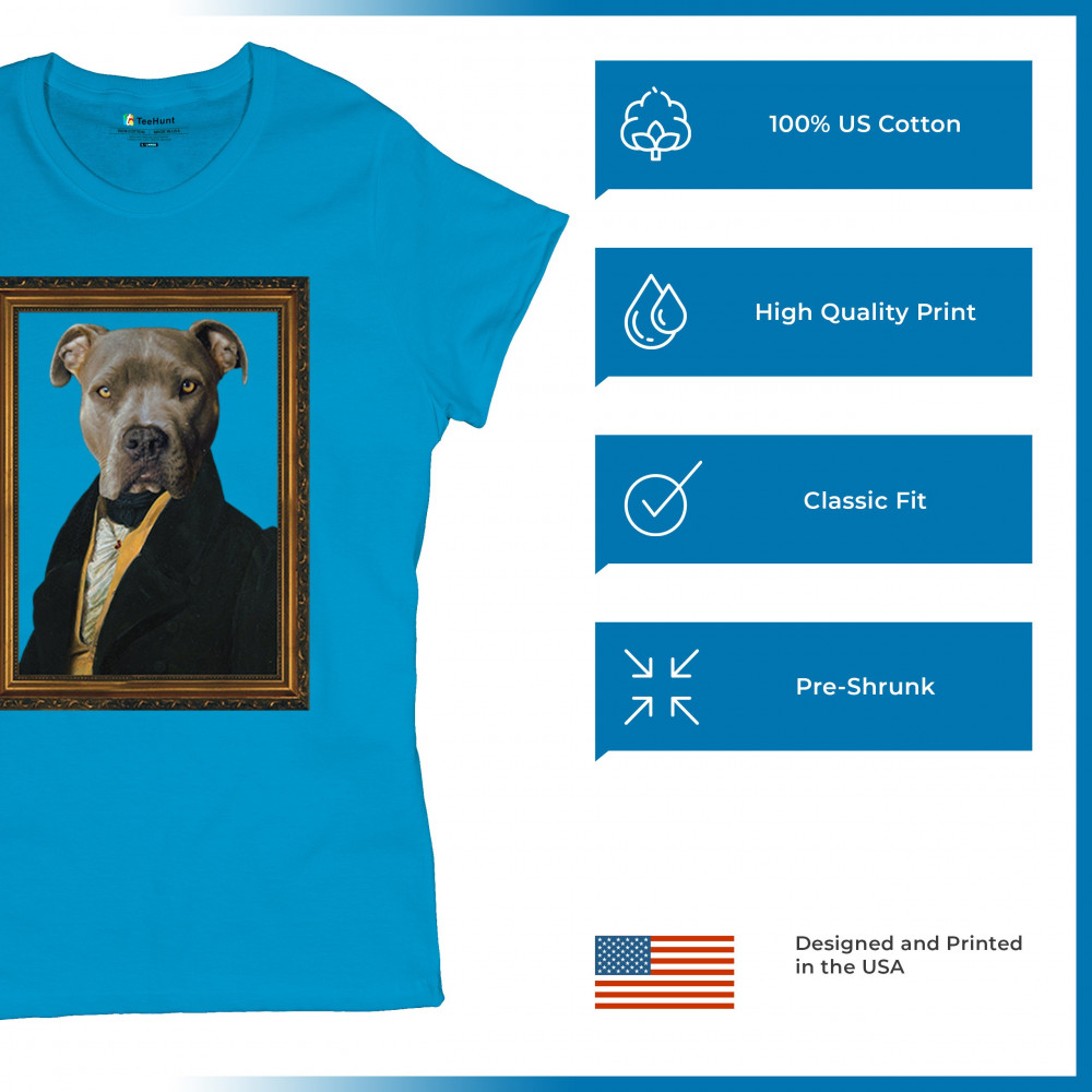 Unique pit bull portrait in 18th-century attire, blending humor and elegance for pet lovers and history enthusiasts. Perfect for home or office decor.