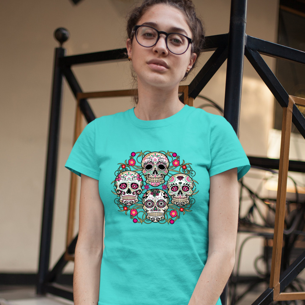 DAY OF THE DEAD FLORAL SUGAR SKULLS t-shirt dia de los muertos women's tee light blue