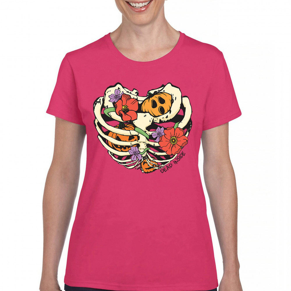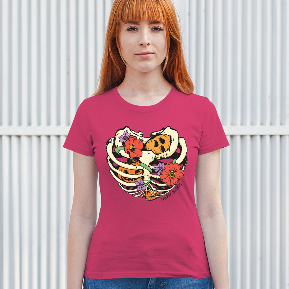 Celebrate Halloween with a quirky and cute design featuring a skeleton ribcage filled with pumpkins and flowers. Perfect for spooky season lovers!