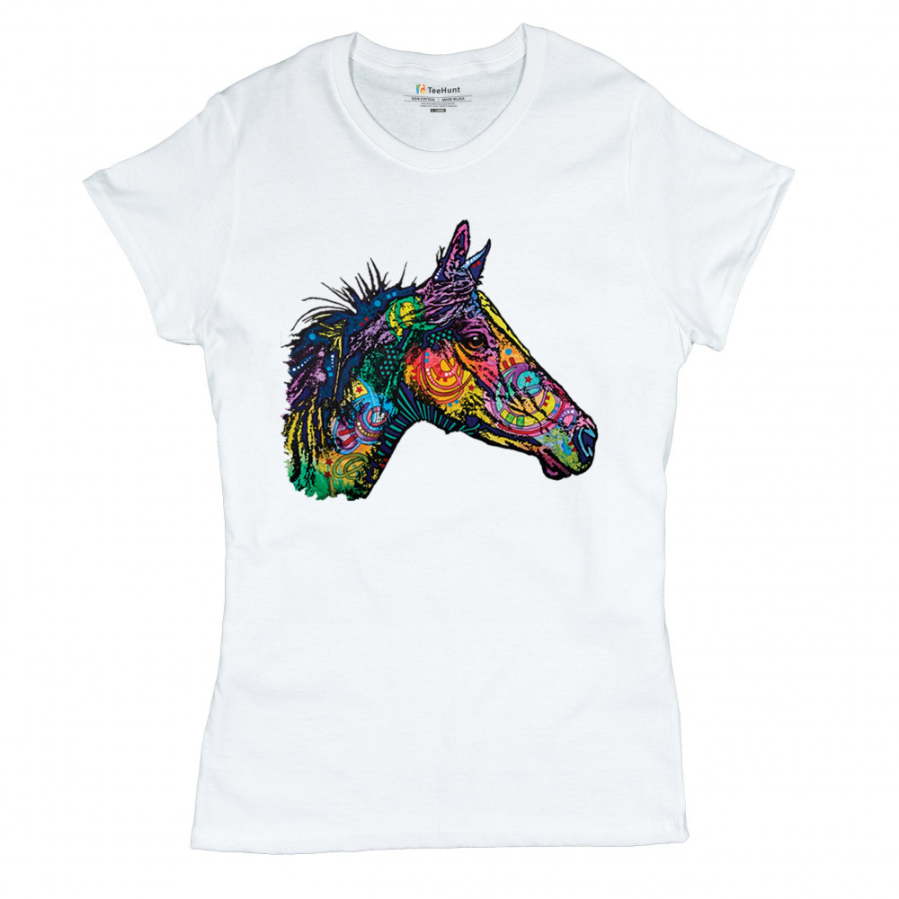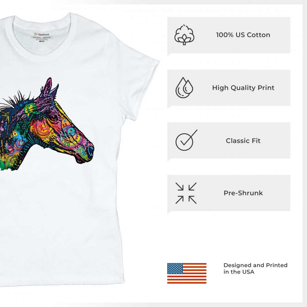 DEAN RUSSO COLORFUL HORSE t-shirt neon mosaic wild mustang animal women's tee white