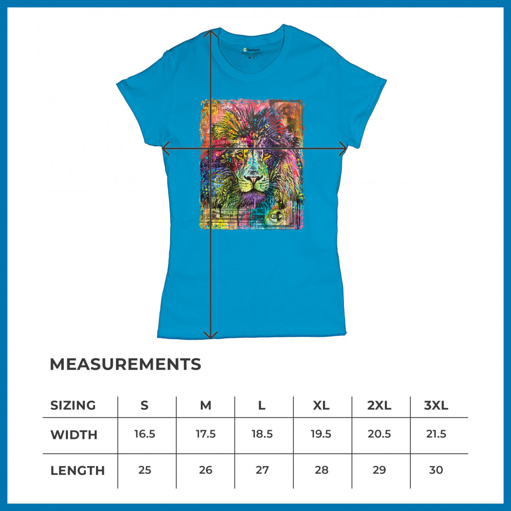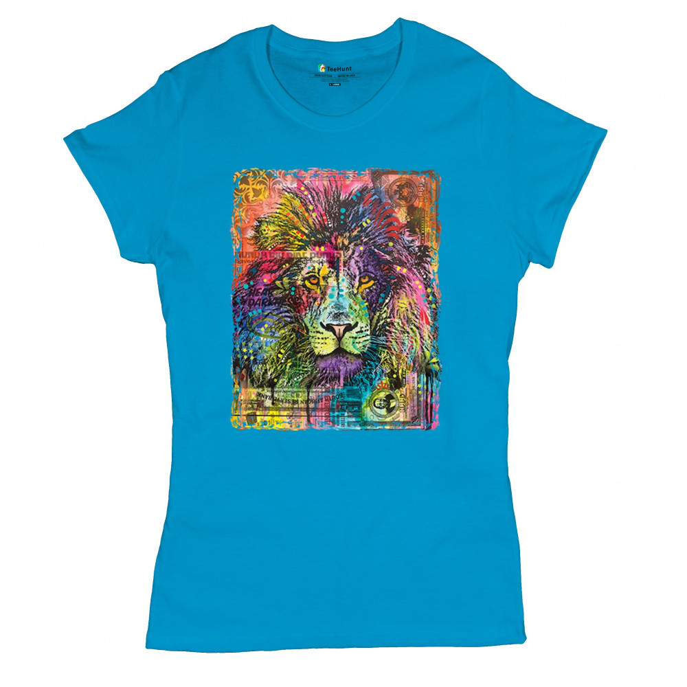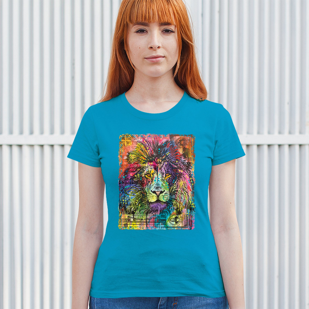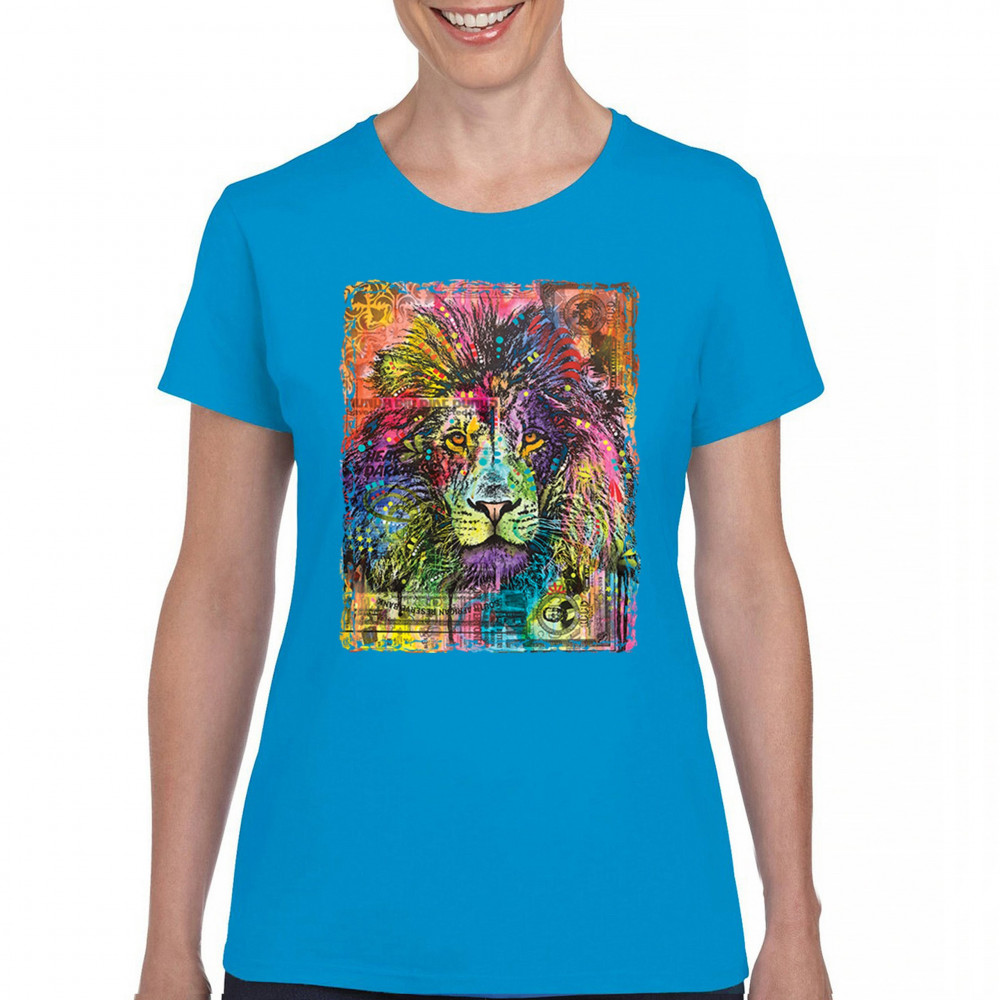 DEAN RUSSO COLORFUL LION HEAD t-shirt wild life king roar big cat women's tee light blue