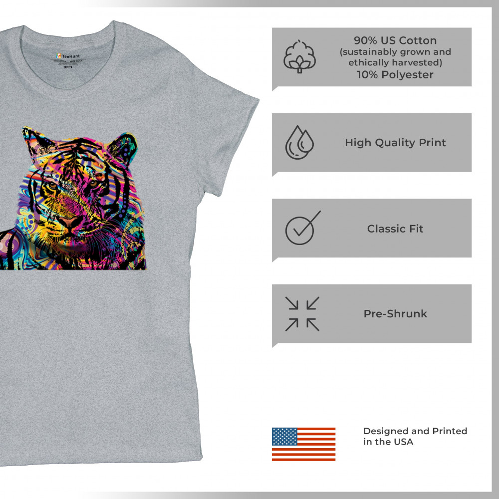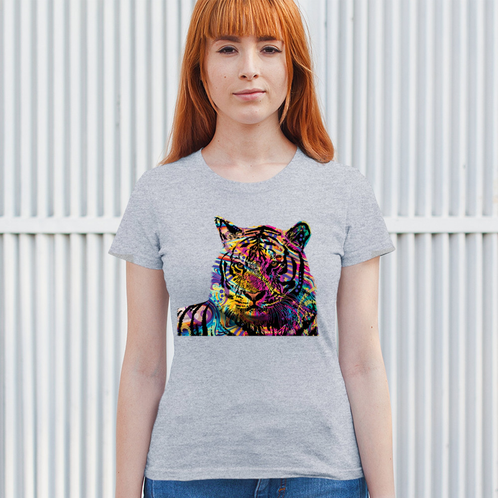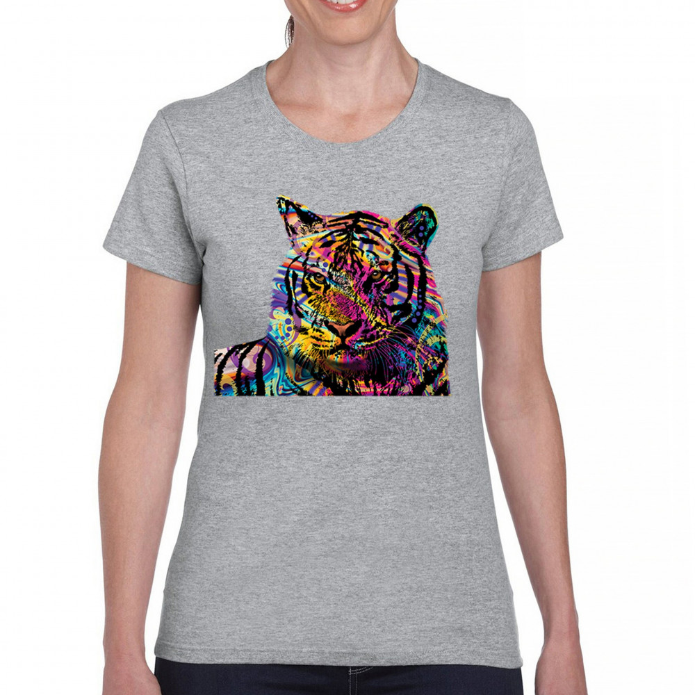 DEAN RUSSO COLORFUL NEON SIBERIAN TIGER t-shirt wild big cat women's tee gray