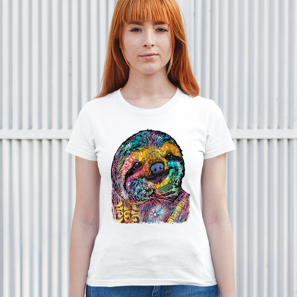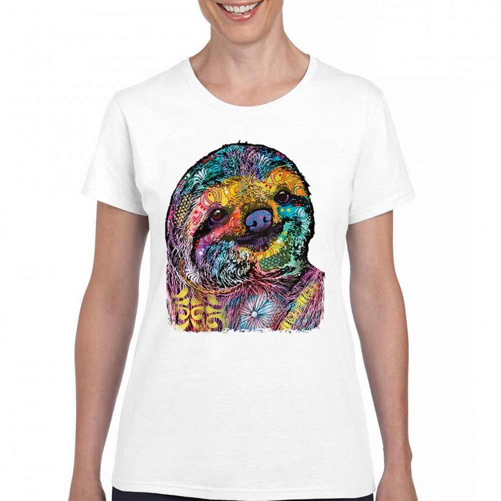 DEAN RUSSO CUTE LAZY SLOTH t-shirt funny wild life colorful women's tee white