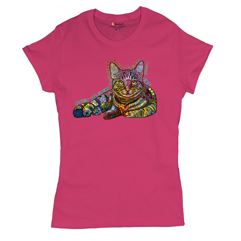 DEAN RUSSO CUTE NEON CAT t-shirt first we steal your heart kitten women's tee pink