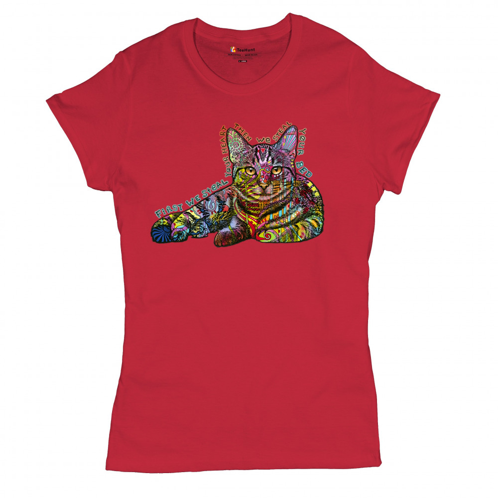 DEAN RUSSO CUTE NEON CAT t-shirt first we steal your heart kitten women's tee red