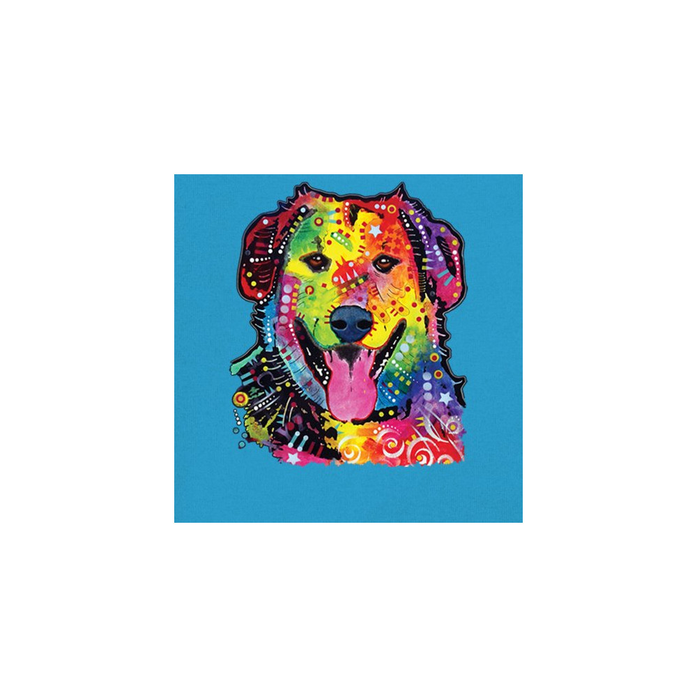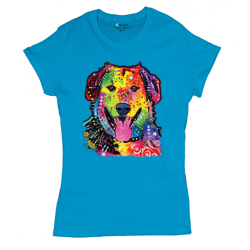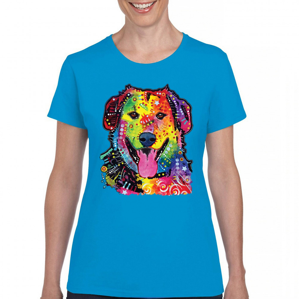 DEAN RUSSO CUTE NEON DOG t-shirt rescue adopt a pet colorful pet women's tee light blue