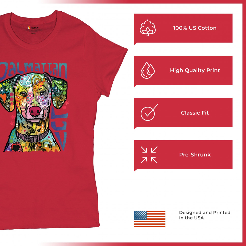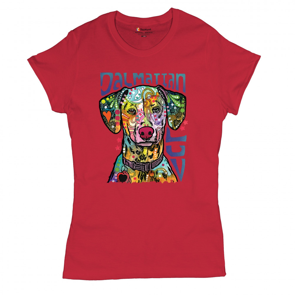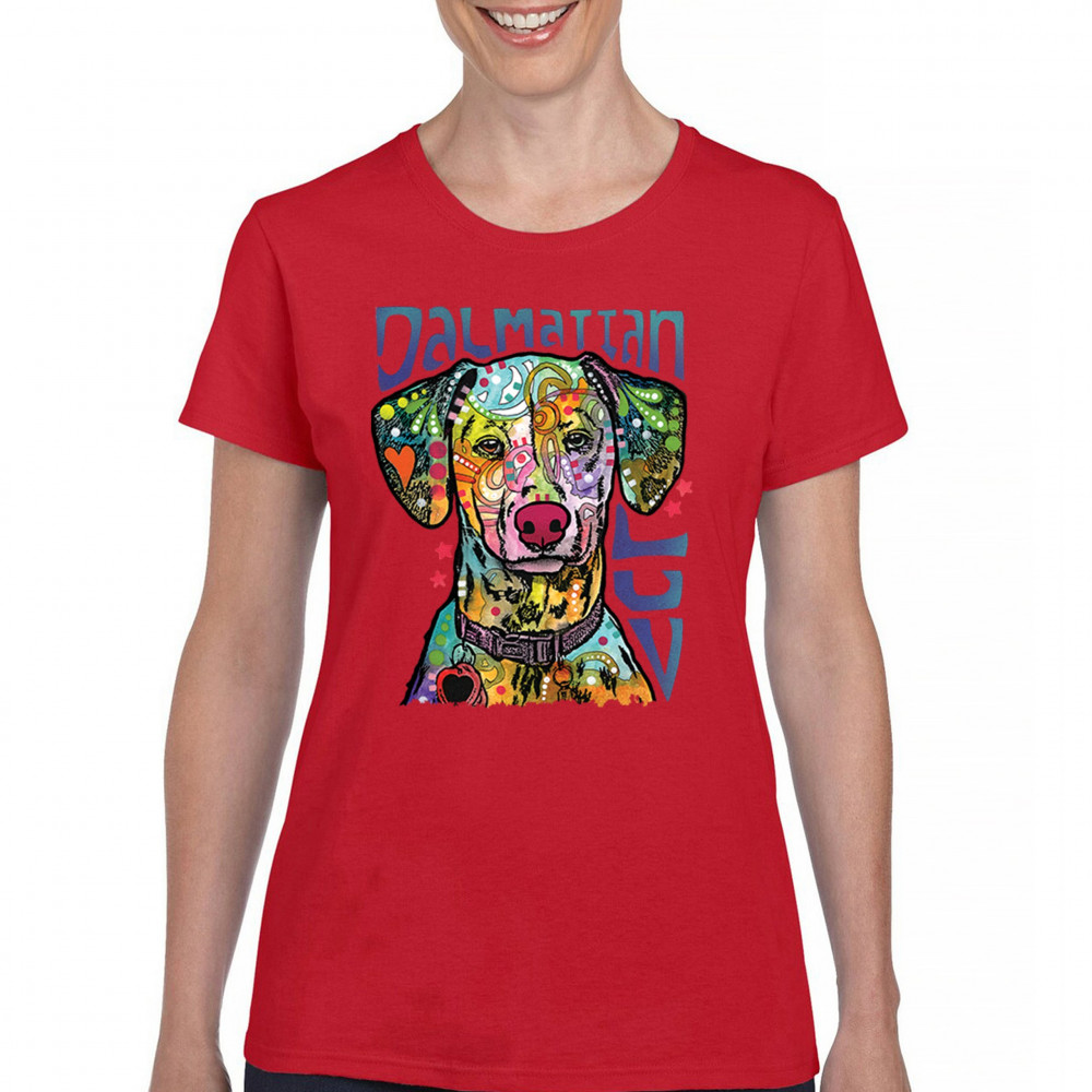 DEAN RUSSO DALMATIAN LUV COLORFUL DOG t-shirt neon puppy lover women's tee red