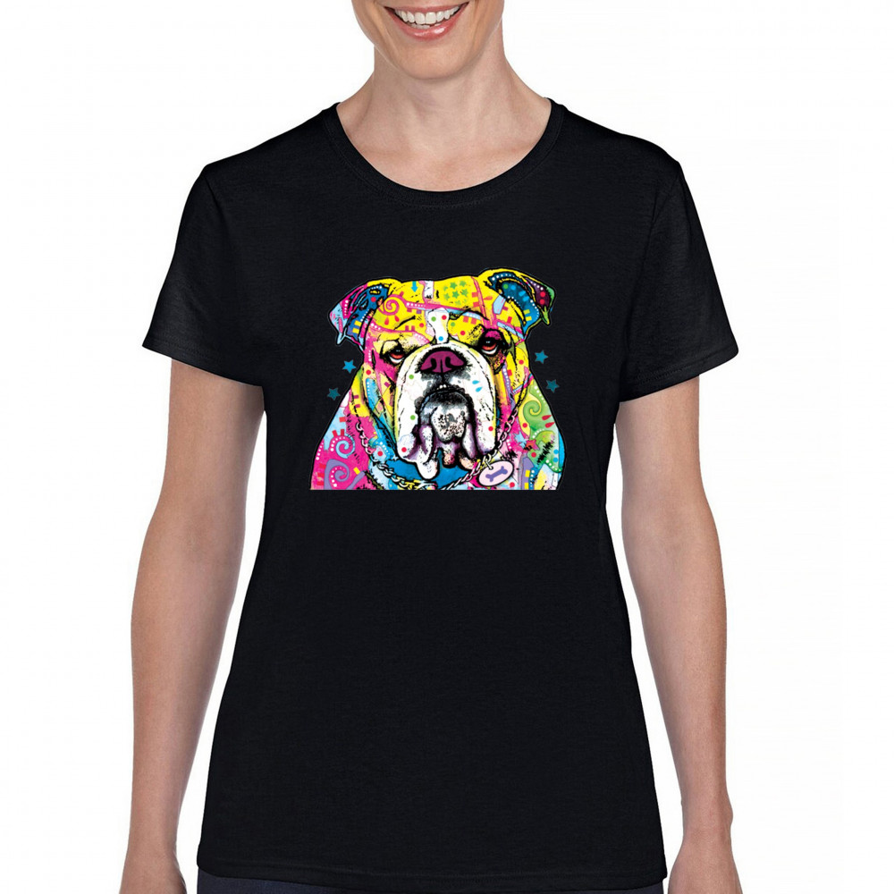 DEAN RUSSO SERIOUS BULLDOG t-shirt colorful dog best friend women's tee black
