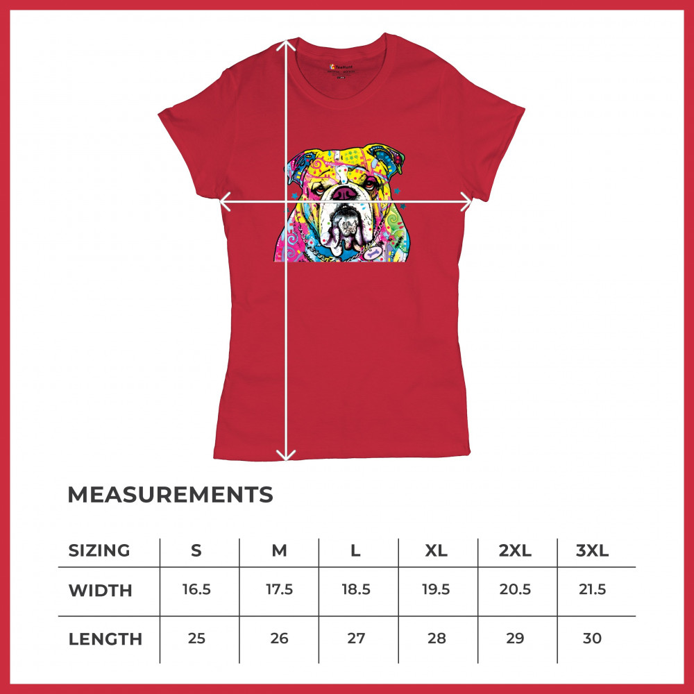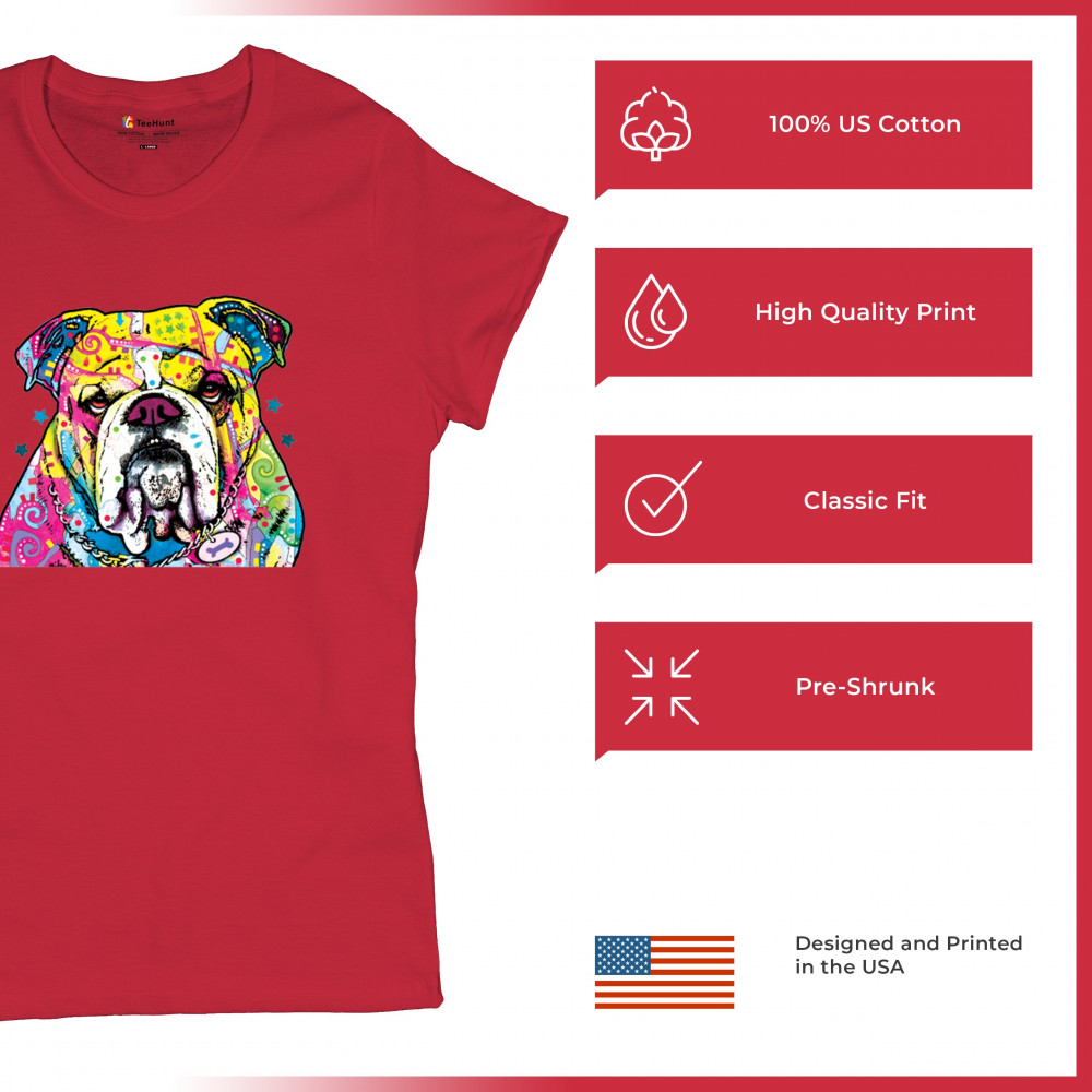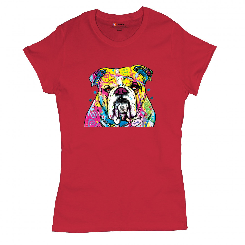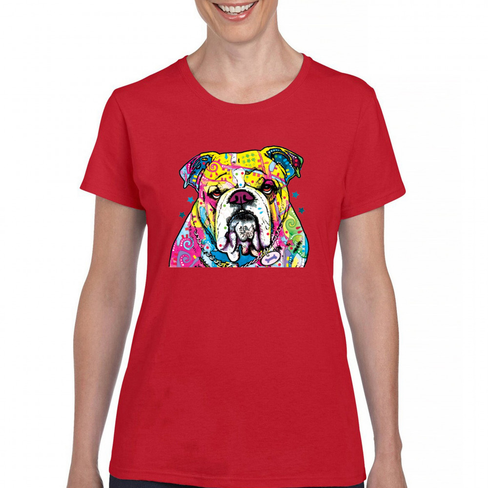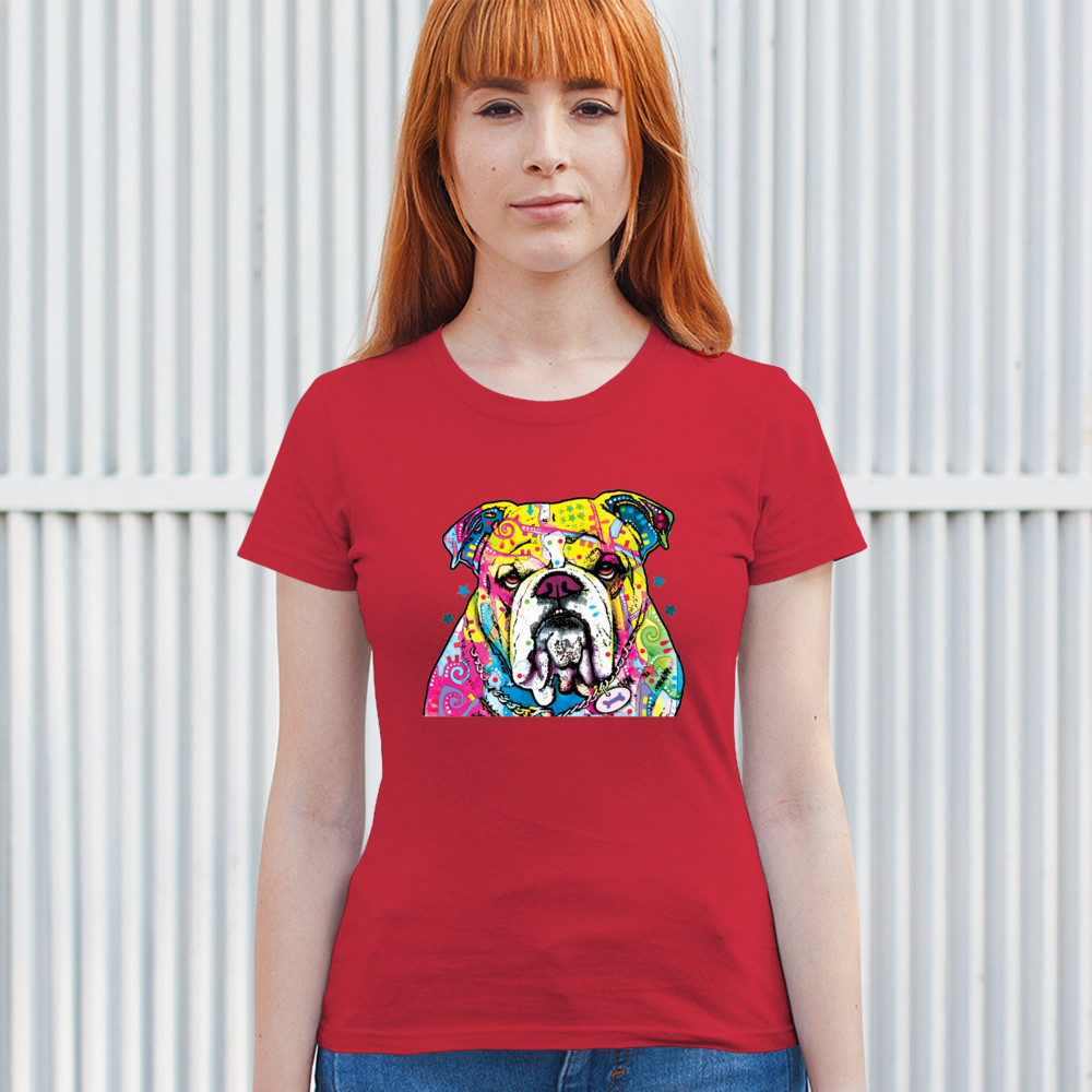 DEAN RUSSO SERIOUS BULLDOG t-shirt colorful dog best friend women's tee red