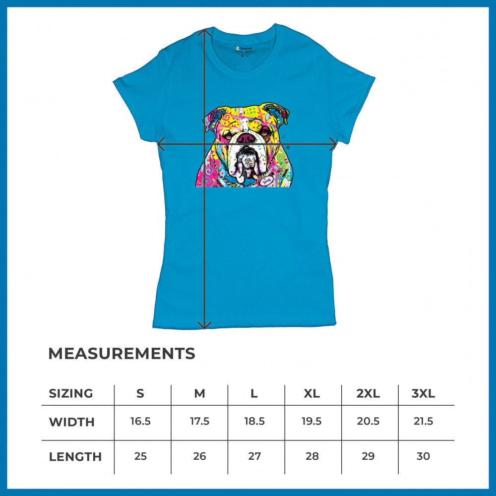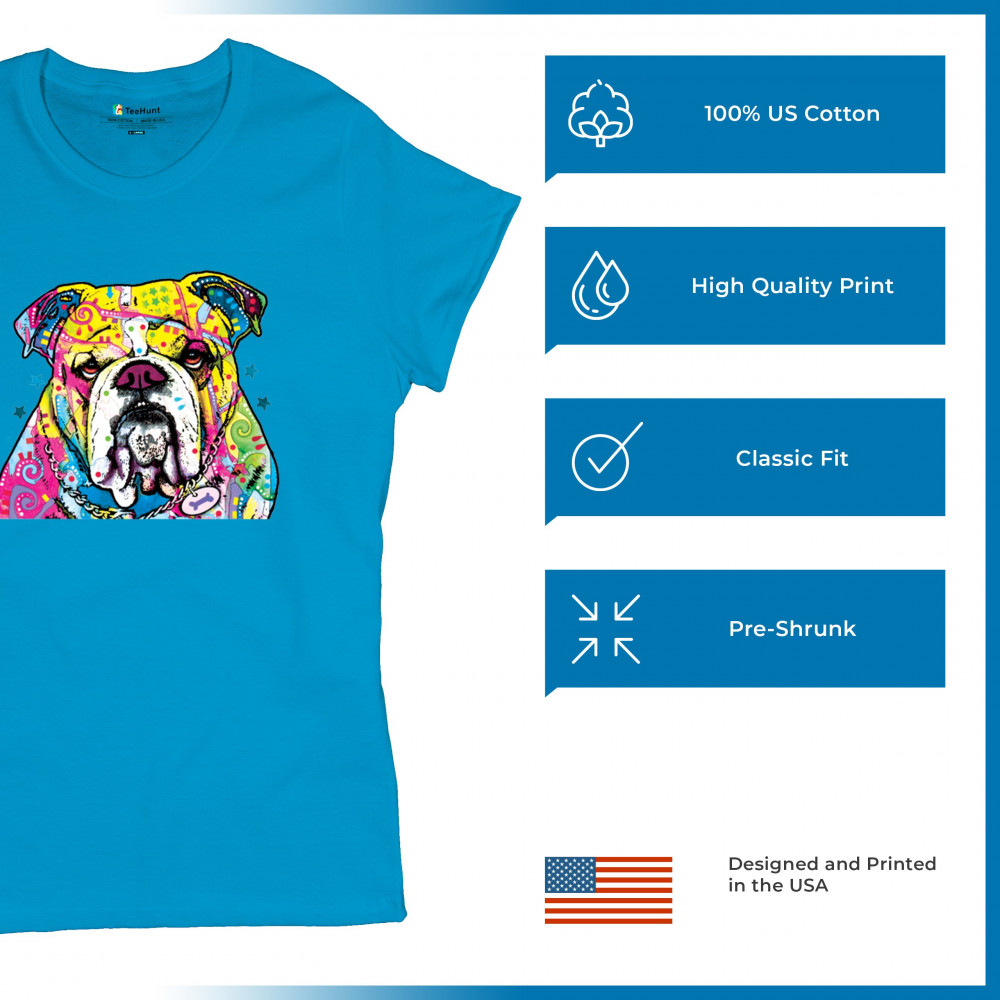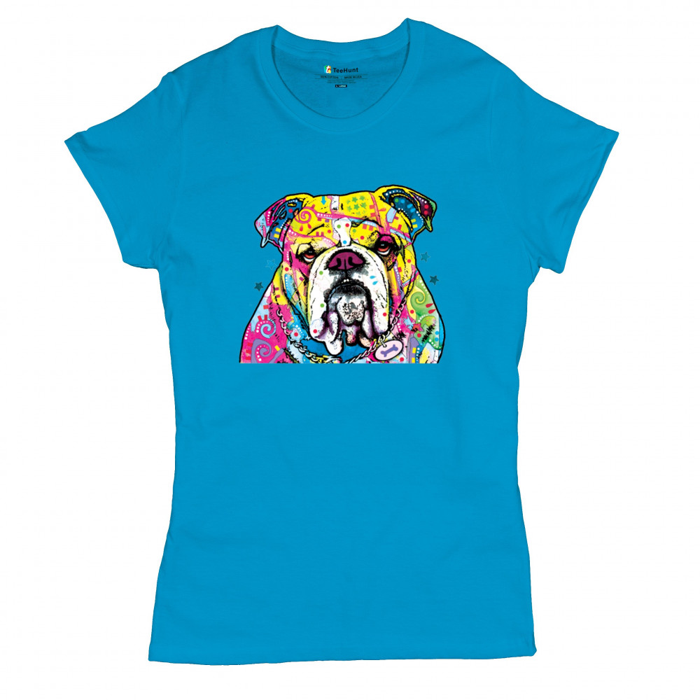 DEAN RUSSO SERIOUS BULLDOG t-shirt colorful dog best friend women's tee light blue