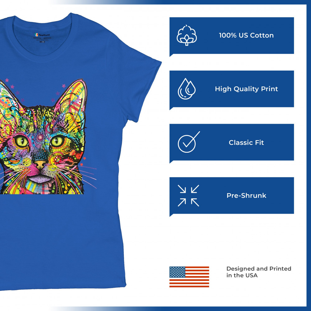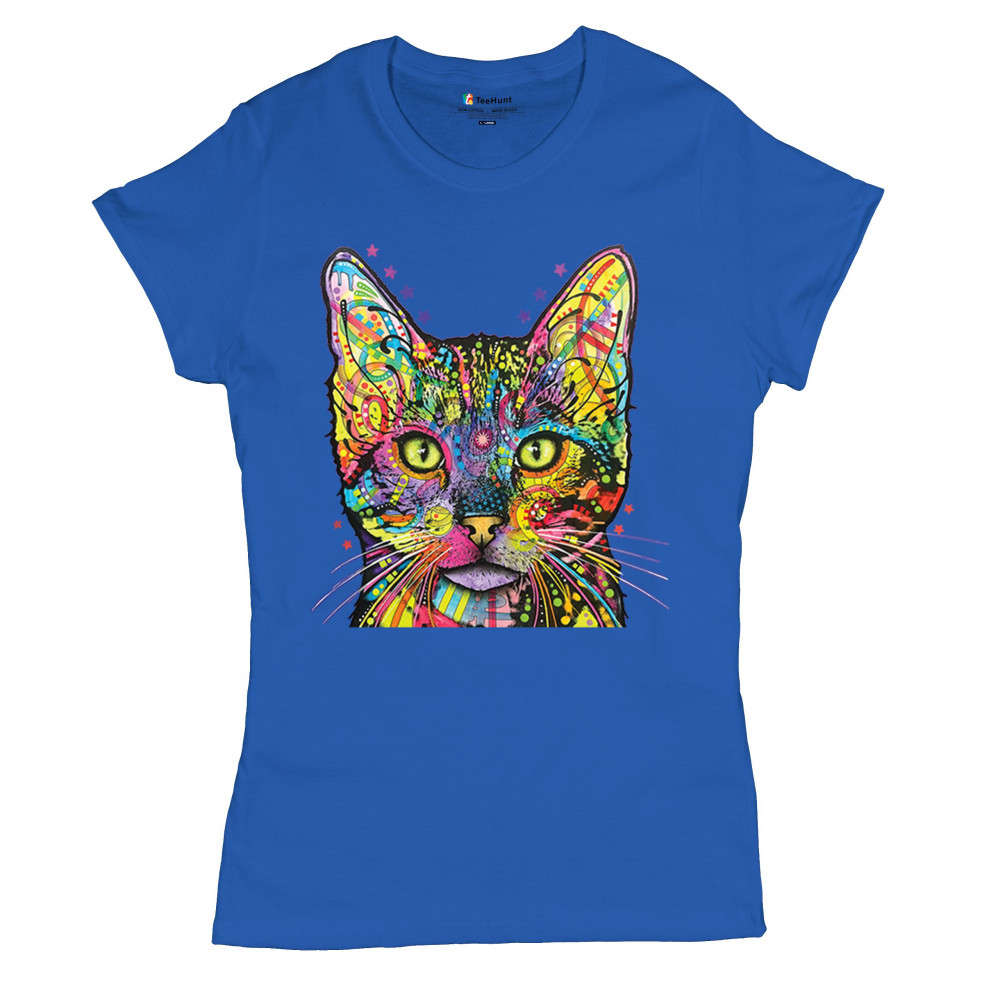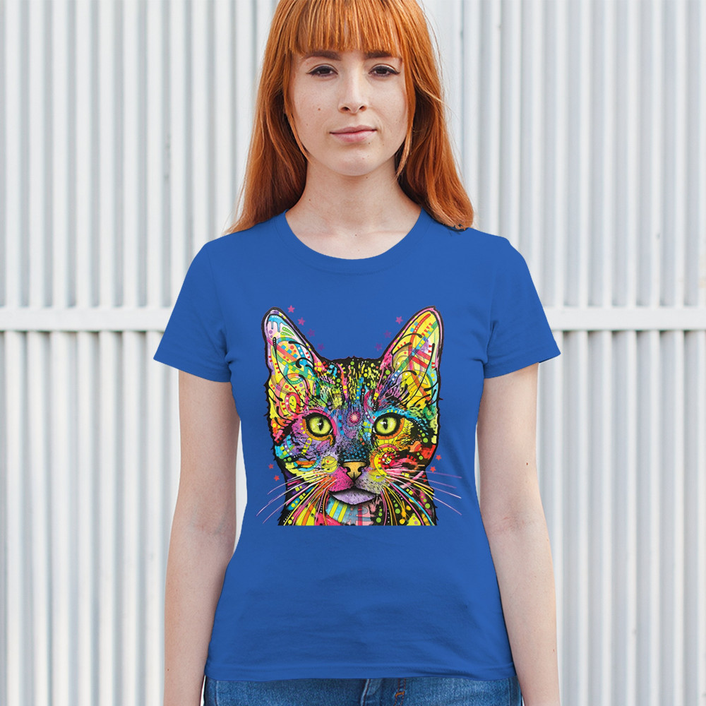 DEAN RUSSO SHIVA CAT STARE t-shirt neon mosaic colorful kitten eyes women's tee royal blue