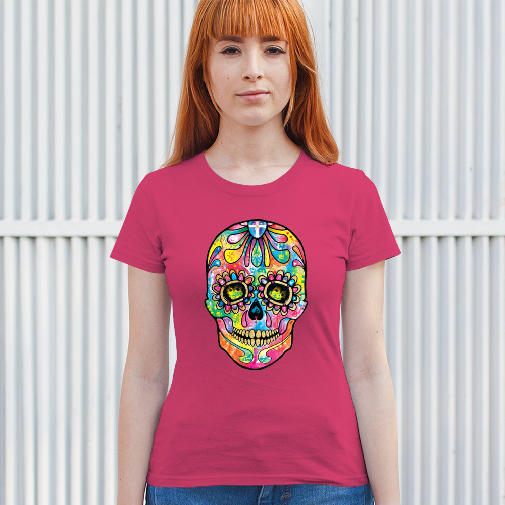 DEAN RUSSO SUGAR SKULL t-shirt day of the dead neon calavera women's tee pink