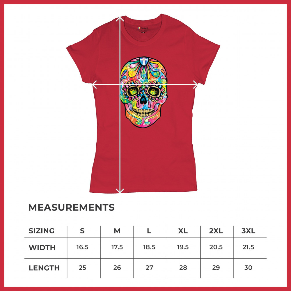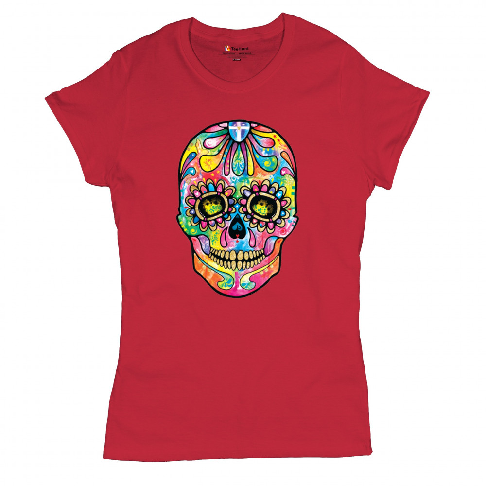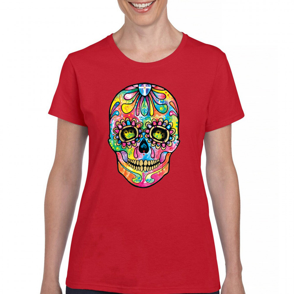 DEAN RUSSO SUGAR SKULL t-shirt day of the dead neon calavera women's tee red